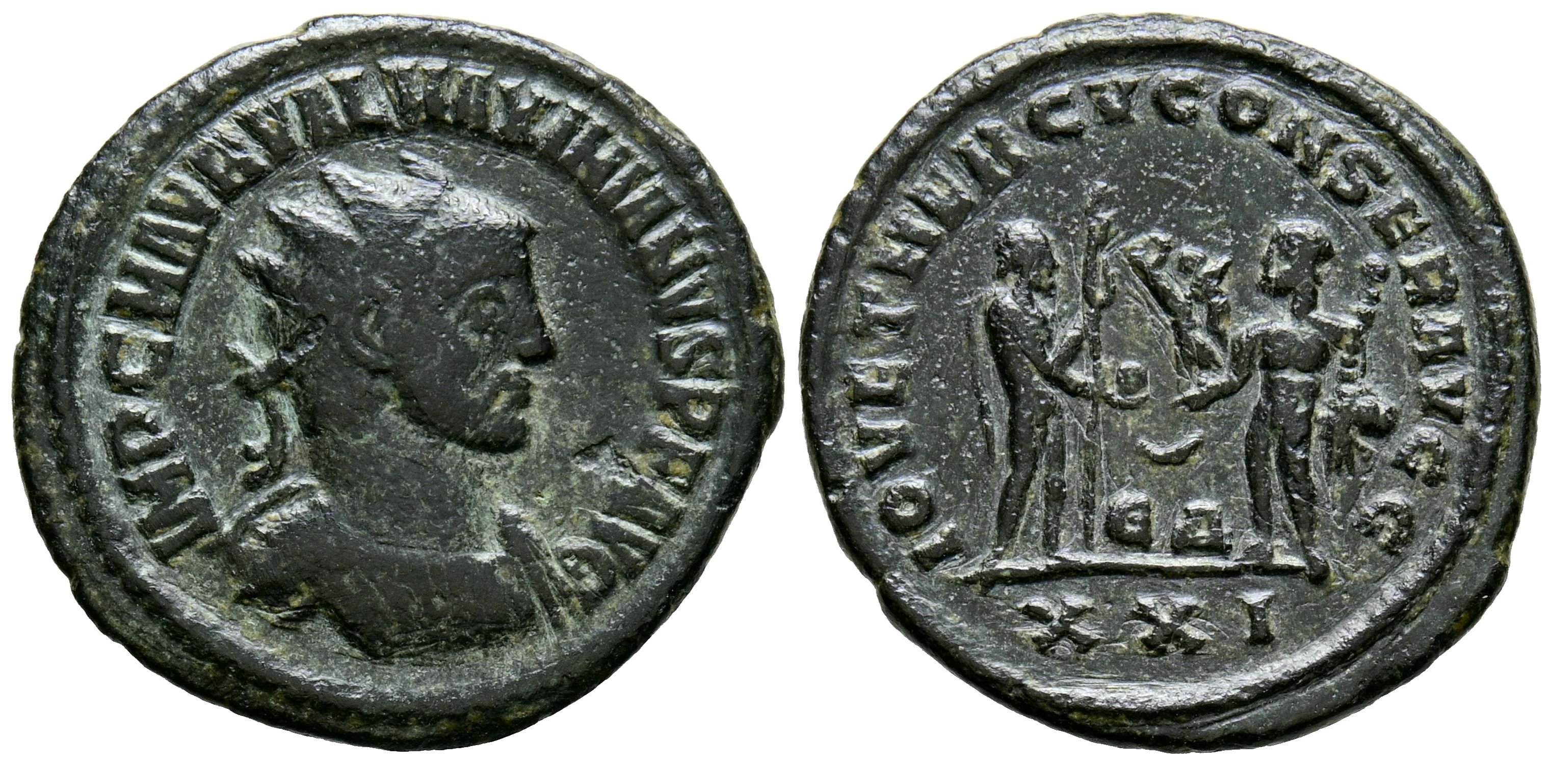 MAXIMIANO I. Antoniniano. (Ae. 3,61g/22mm). 285-295 d.C. Antioquía. (RIC 622). Anv: Busto radiado y con coraza de Maximiano a derecha, alrededor leyenda: IMP C M AVR VAL MAXIMIANVS P F AVG. Rev: Júpiter estante a derecha portando globo y lanza, delante Hércules estante a izquierda portando mazo y Victoria con corona de laurel, entre ellos: Creciente/EA, en exergo: XXI, alrededor leyenda: IOVI ET HERCVLI CONSER AVGG. MBC. Limpiado.