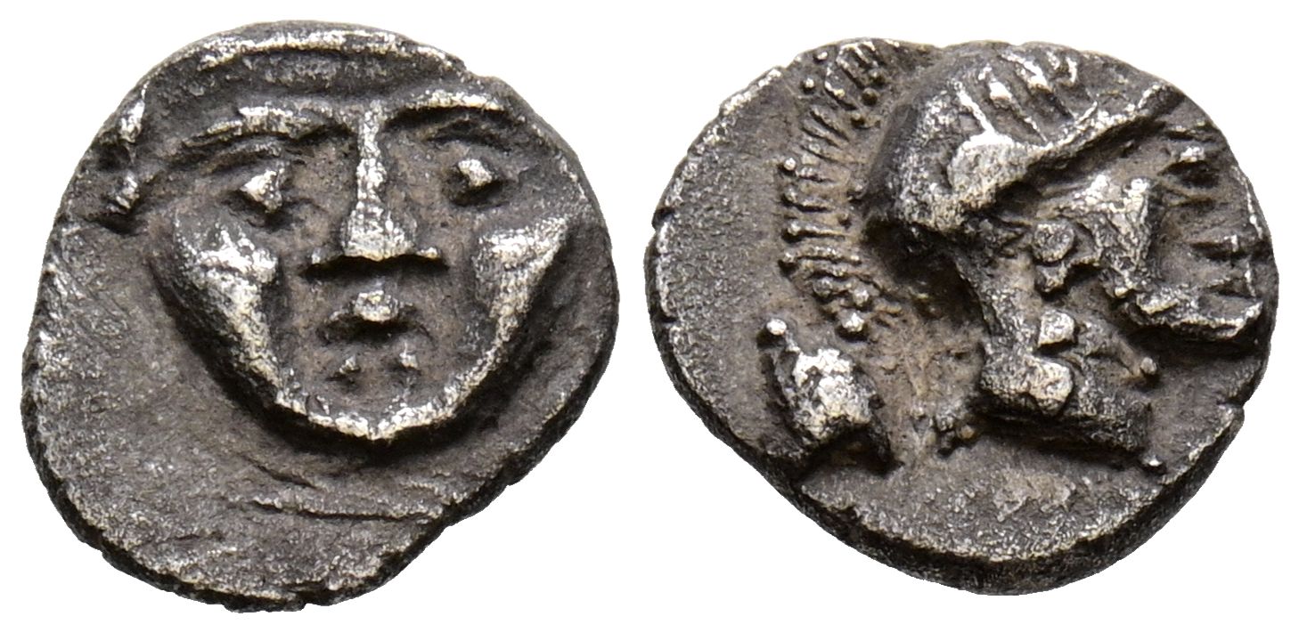 PISIDIA, Selge. Obolo. (Ar. 0,90g/10mm). 350-300 a.C. (SNG von Aulock 5278; SNG BnF 1932). Anv: Gorgoneion de frente. Rev: Cabeza de Atenas con casco a derecha, detrás astrágalos. MBC.