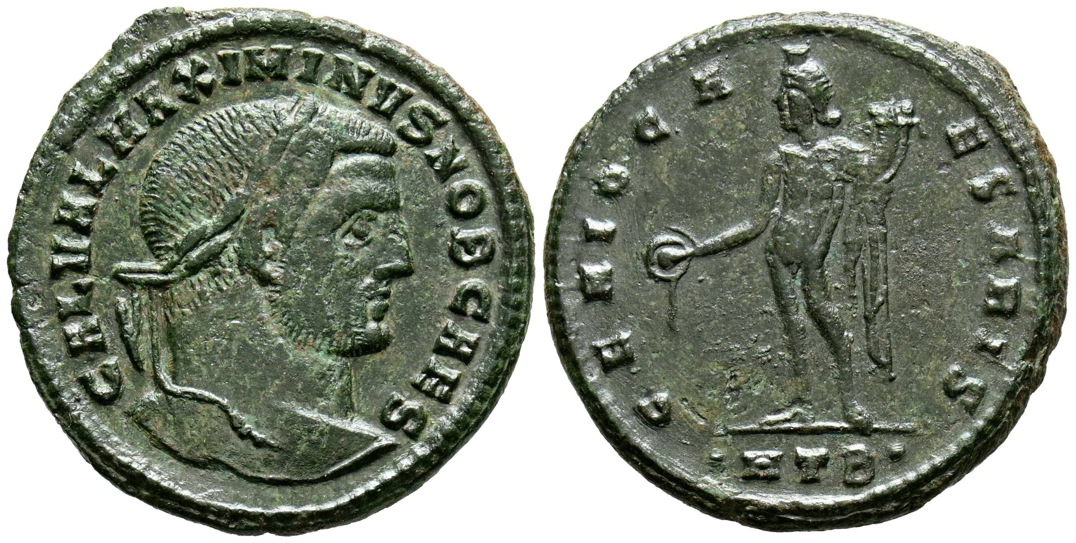 MAXIMINO II. Follis. (Ae. 6,78g/28mm). 309-313 d.C. Heráclea. (RIC 36). Anv: Cabeza laureada de Maximino II a derecha, alrededor leyenda: GAL VAL MAXIMINVS NOB CAES. Rev: Genio estante a izquierda portando pátera y cornucopia, en exergo: HTB, alrededor leyenda: GENIO CAESARIS. EBC-. Bonita pátina verde.