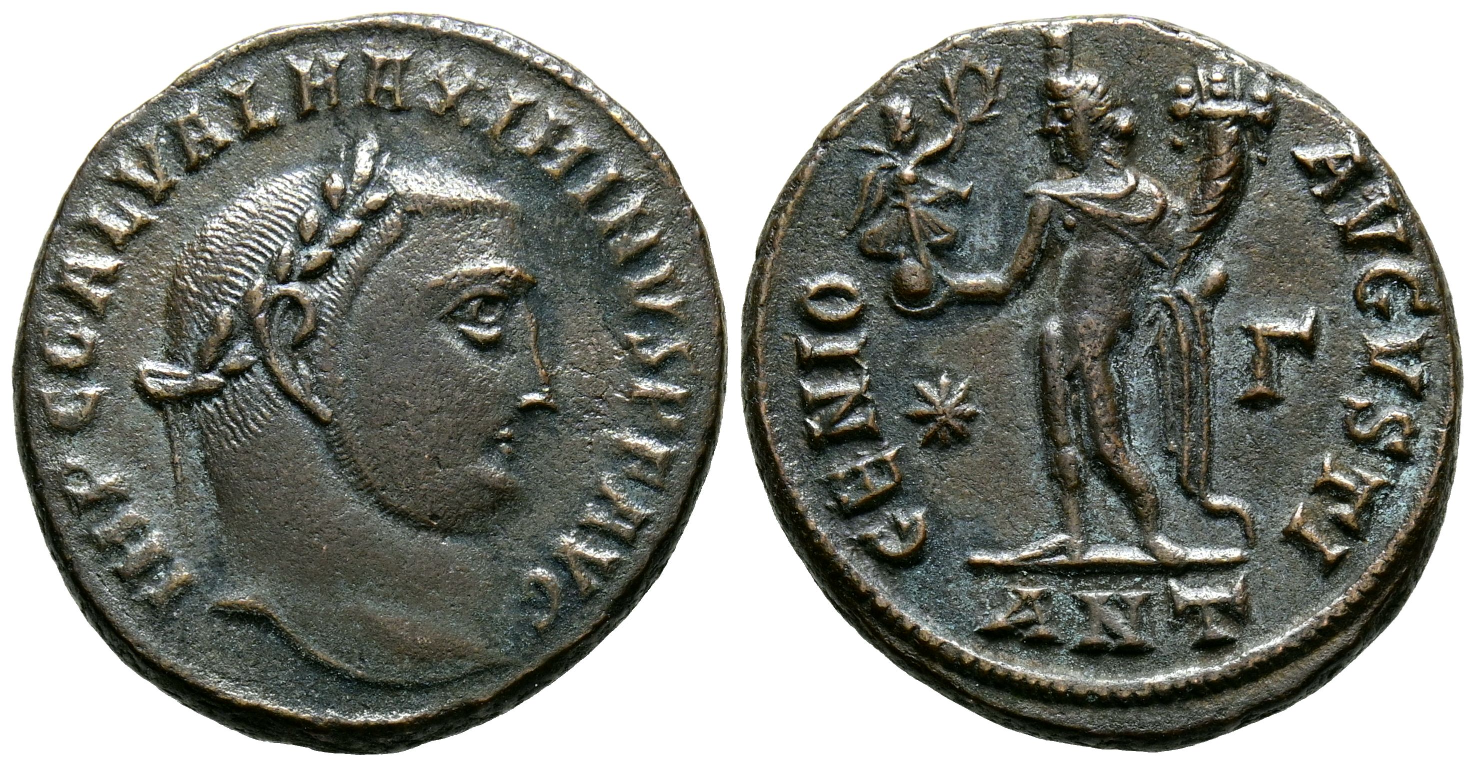 MAXIMINO II. Follis. (Ae. 5,10g/21mm). 312 d.C. Antioquía. (RIC 162b). Anv: Cabeza diademada de Maximino II a derecha, alrededor leyenda: IMP C GAL VAL MAXIMINVS P F AVG. Rev: Genio estante a izquierda portando Victoria con corona de laurel sobre globo y cornucopia, entre: estrella y r, en exergo: ANT, alrededor leyenda: GENIO AVGVSTI. MBC.