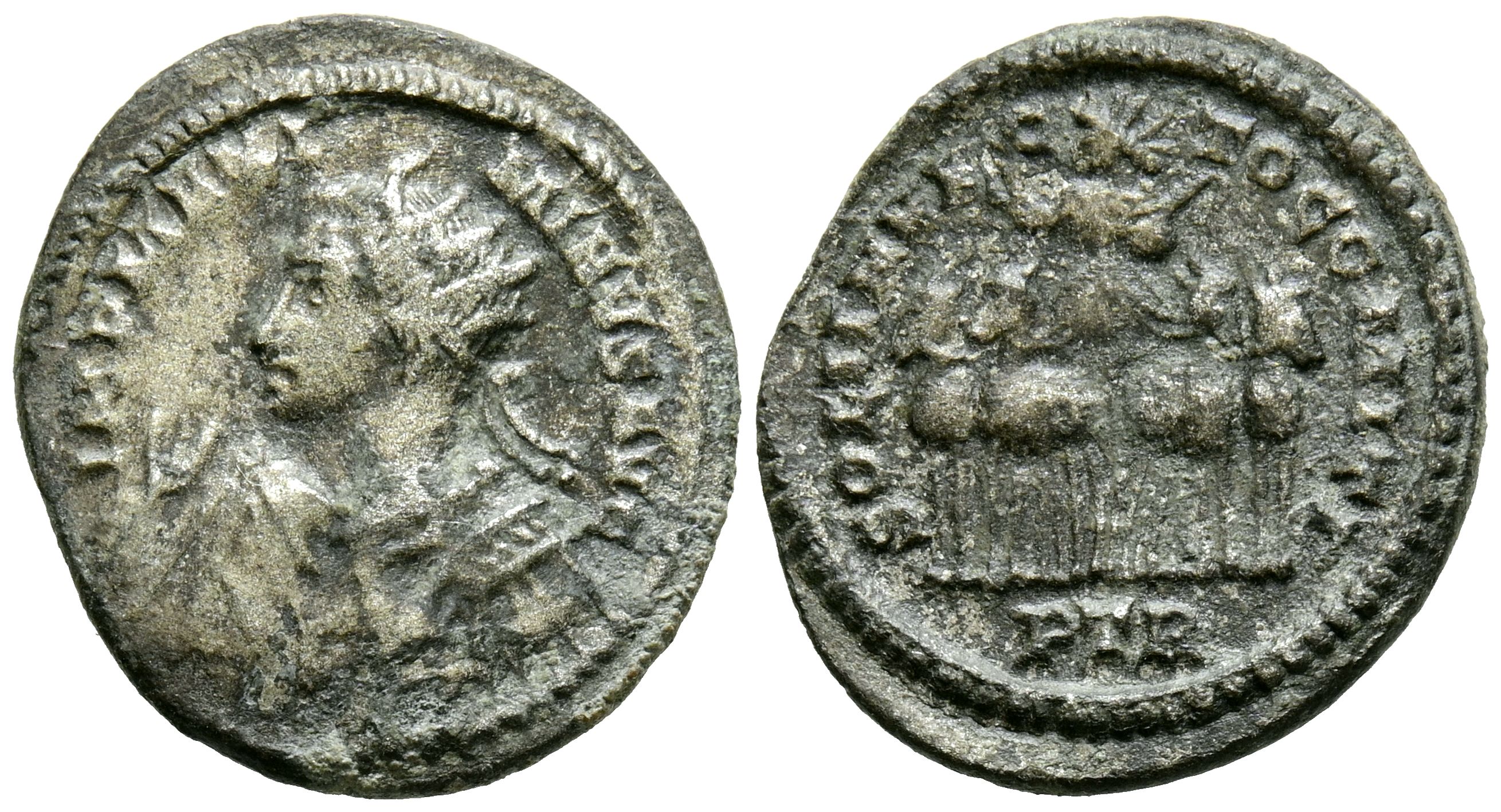 MAXIMINO II. Argenteo de vellón. (Ve. 2,62g/20mm). 312 d.C. Treveri. (RIC 826). Anv: Busto radiado y con coraza de Maximino II a izquierda alzando mano derecha, alrededor leyenda: IMP MAXIMINVS AVG. Rev: Sol estante de frente portando látigo y conduciendo cuádriga, en exergo: PTR, alredededor leyenda: SOL INVICTO COMITI. MBC-. Escaso ejemplar.