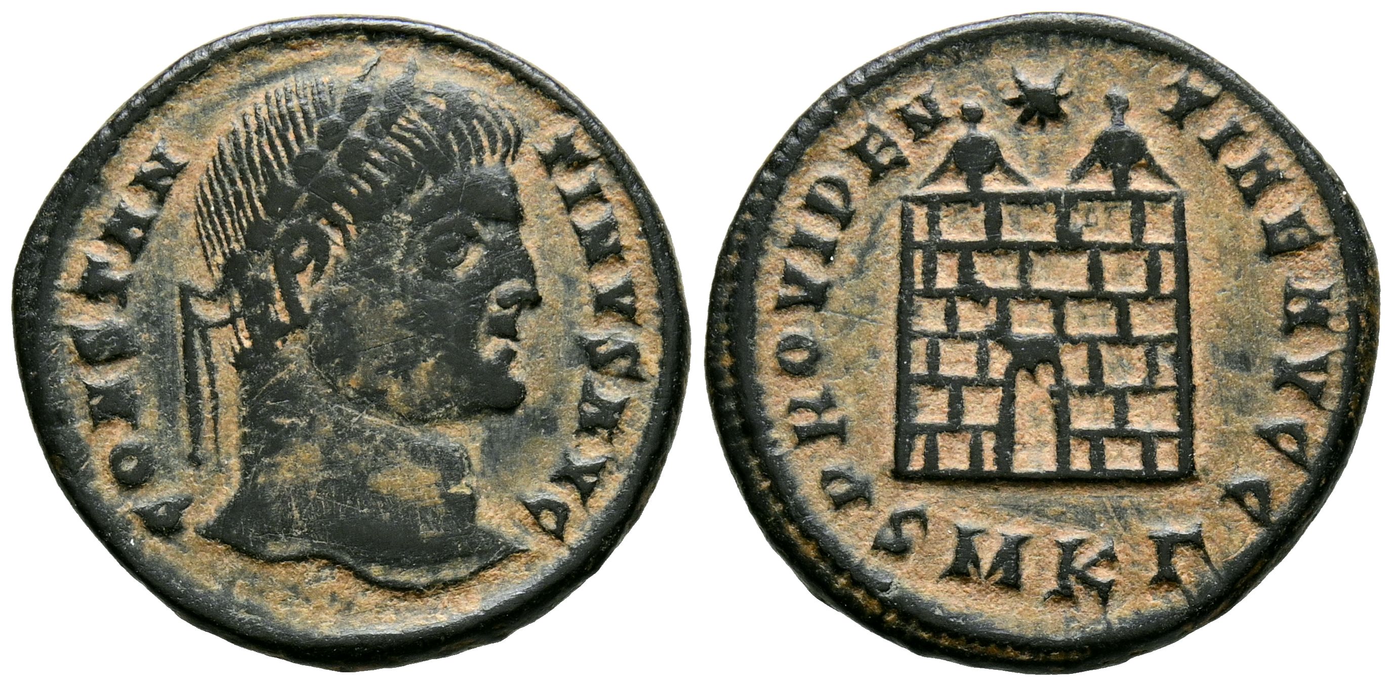 CONSTANTINO I. Follis. (Ae. 2,93g/19mm). 326-327 d.C. Cícico. (RIC 44). Anv: Cabeza laureada de Constantino I a derecha, alrededor leyenda: CONSTANTINVS AVG. Rev: Puerta de campamento, encima estrella entre dos torretas, en exergo: SMKr, alrededor leyenda: PROVIDENTIAE AVGG. MBC+.