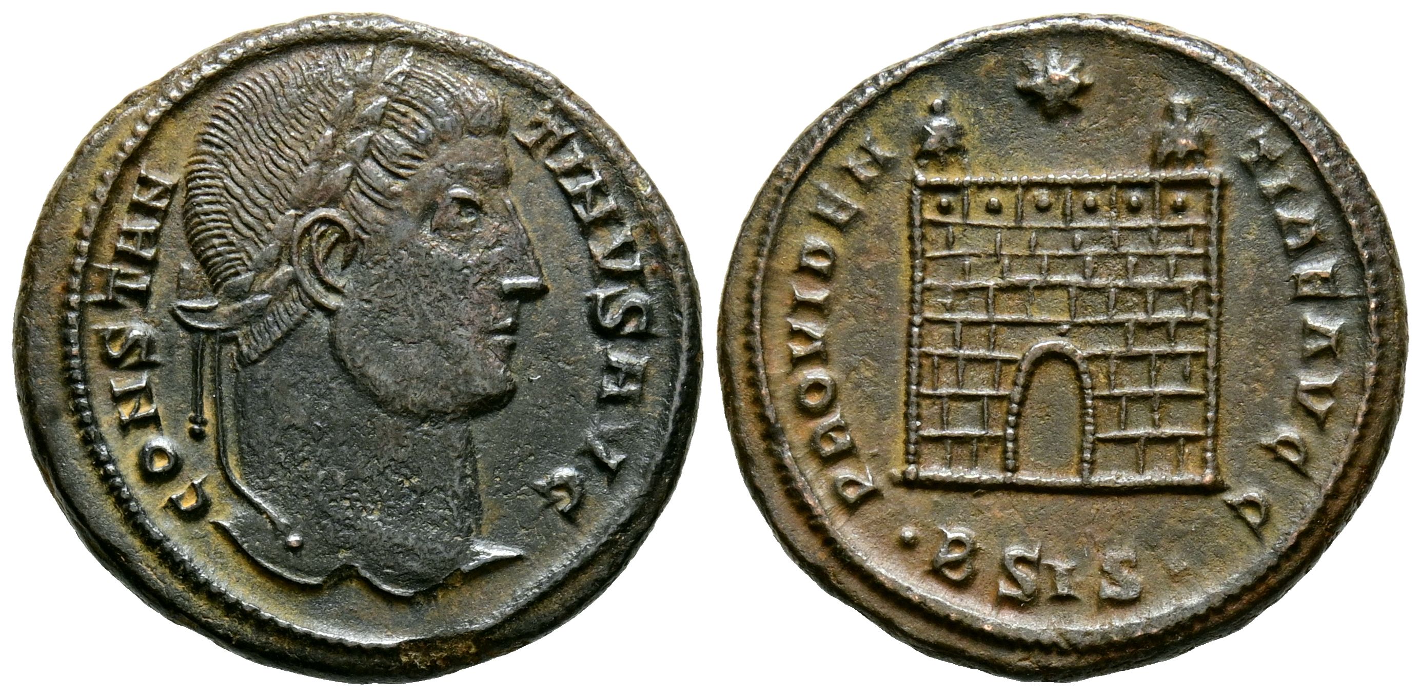 CONSTANTINO I. Follis. (Ae. 3,30g/19mm). 326-327 d.C. Siscia. (RIC 200). Anv: Cabeza laureada de Constantino I a derecha, alrededor leyenda: CONSTANTINVS AVG. Rev: Puerta de campamento, encima dos torretas, entre ellas estrella, debajo: BSIS, alrededor leyenda: PROVIDENTIAE AVGG. MBC+.