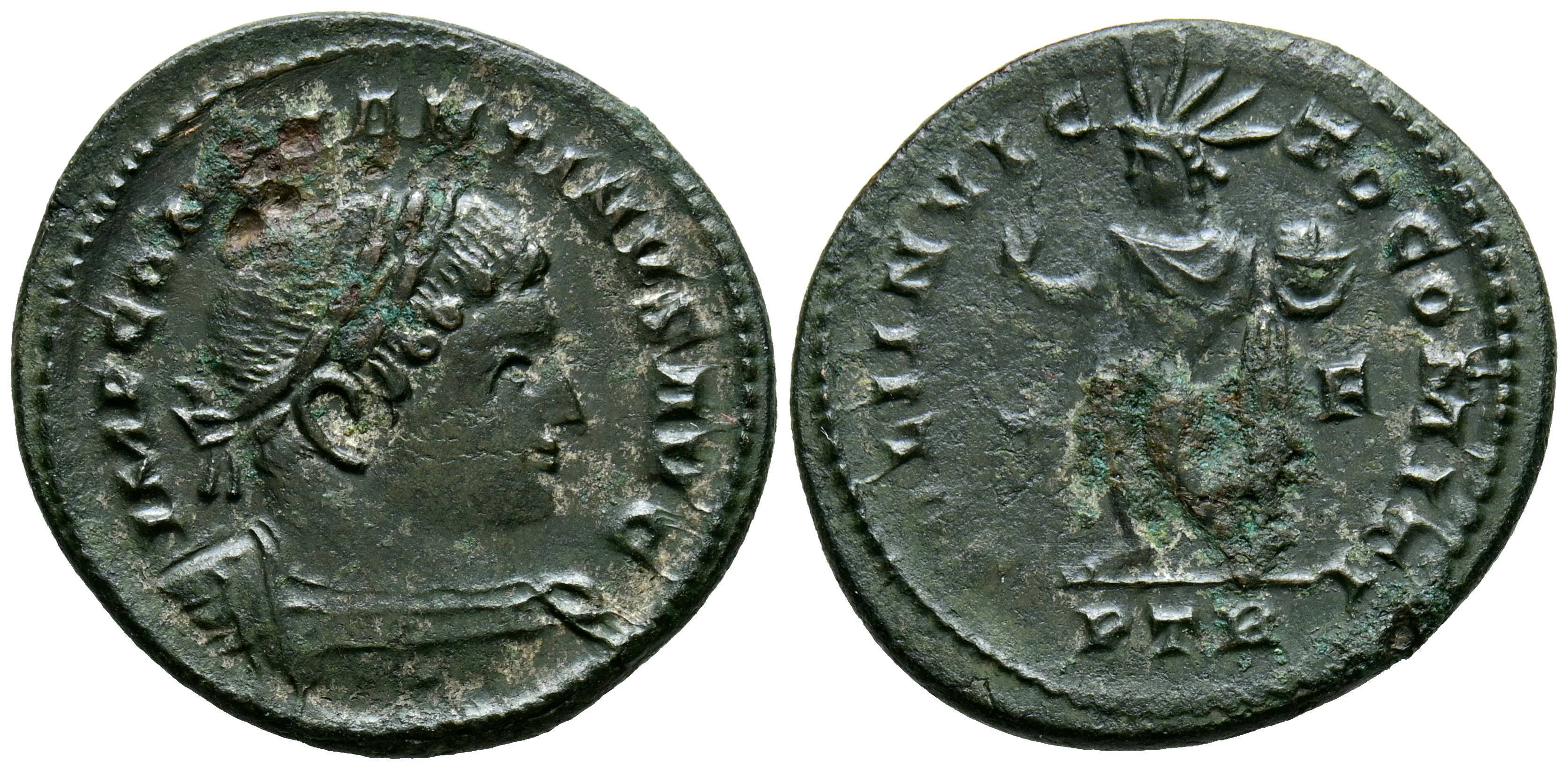 CONSTANTINO I. Follis. (Ae. 4,33g/23mm). 306-337 d.C. Treveri. (RIC 870). Anv: Busto laureado con coraza de Constantino I a derecha, alrededor leyenda: IMP CONSTANTINVS AVG. Rev: Sol estante a izquierda, entre: T-F, en exergo: PTR, alrededor leyenda: SOLI INVICTO COMIT. MBC. Oxidaciones.