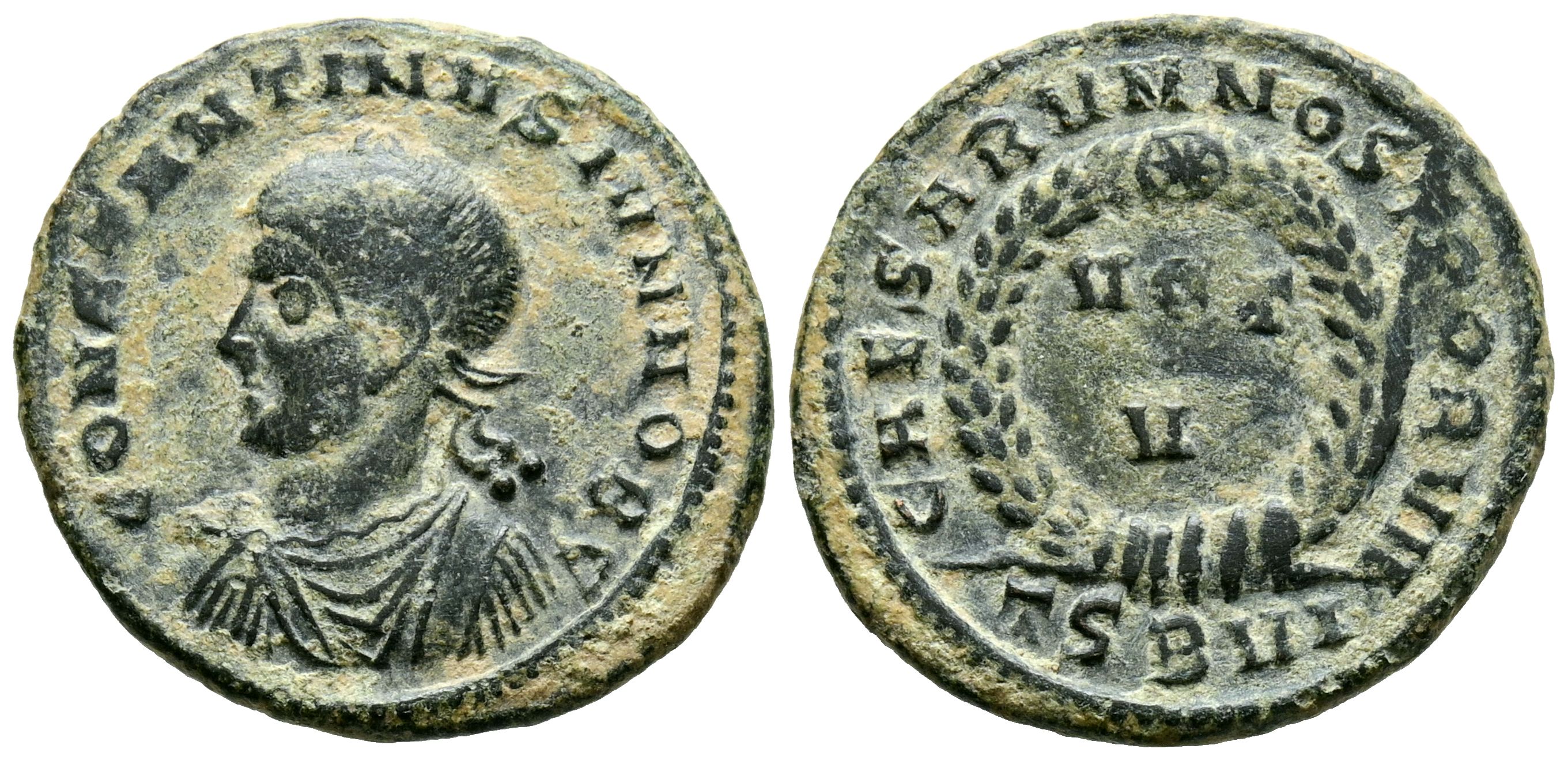 CONSTANTINO II. Follis. (Ae. 2,69g/19mm). 324 d.C. Tesalónica. (RIC 128). Anv: Busto laureado, drapeado y con coraza a izquierda de Constantino II, alrededor leyenda: CONSTANINVS IVN NOB C. Rev: Leyenda; VOT V, dentro de láurea, debajo: TSB VI, alrededor leyenda: CAESARVM NOSTRORVM. MBC/MBC+.