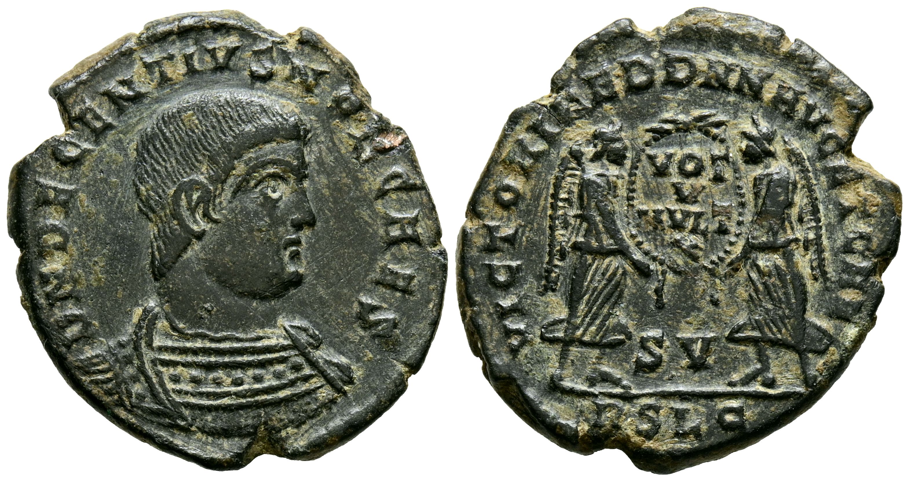 DECENCIO. Maiorina. (Ae. 4,80g/23mm). 350-353 d.C. Lugdunum. (RIC 127). Anv: Busto con coraza de Decencio a derecha, alrededor leyenda: D N DECENTIVS NOB CAES. Rev: Dos Victorias enfrentadas portando escudo con inscripción: VOT/V/MVLTX, entre ellas: SV, en exergo: RSLG, alrededor leyenda: VICTORIAE DD NN AVG ET CAE. MBC+.