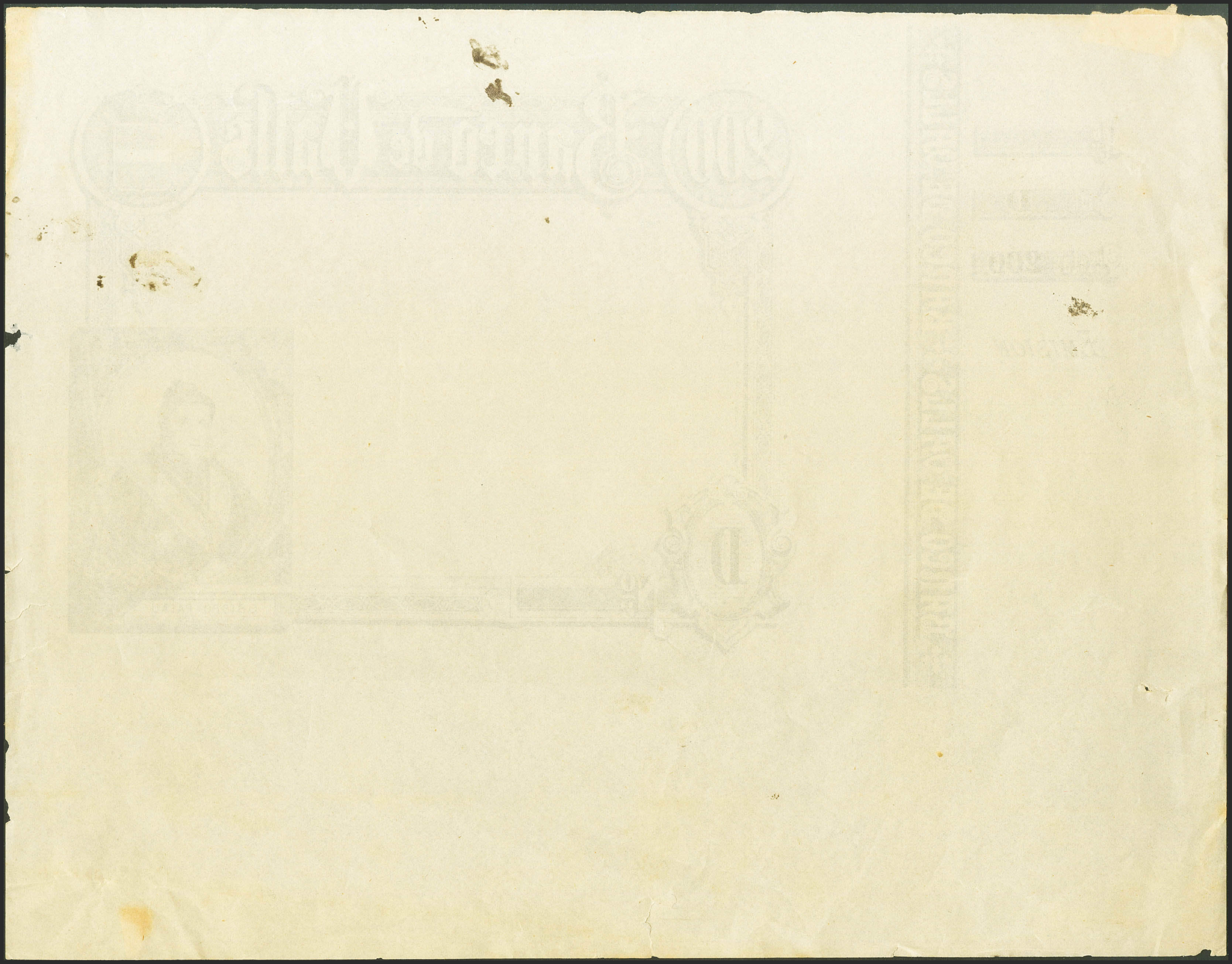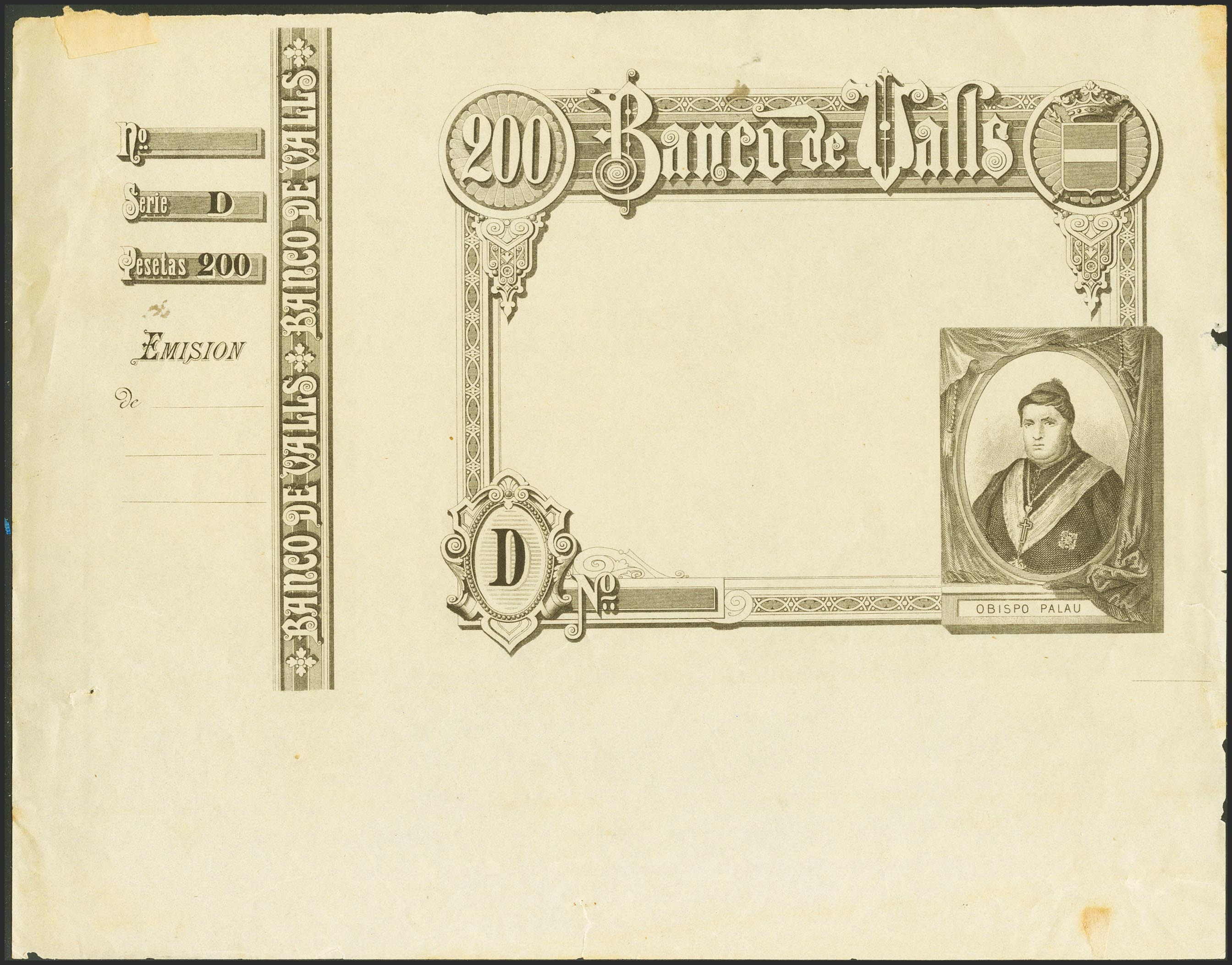 200 Pesetas. (1892ca). Banco de Valls. Prueba de Impresión, con matriz a la izquierda y sin texto, sólo impresión del color negro. Serie D. (Ruiz y Alentorn: 933). SC-.