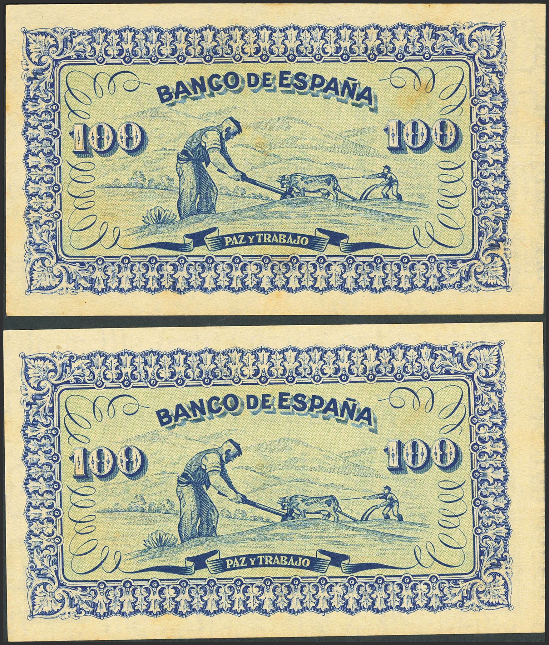 100 Pesetas. Septiembre 1937. Pareja correlativa. Asturias y León. Sin serie. (Edifil 2021: 399). Inusual, apresto original. SC-.