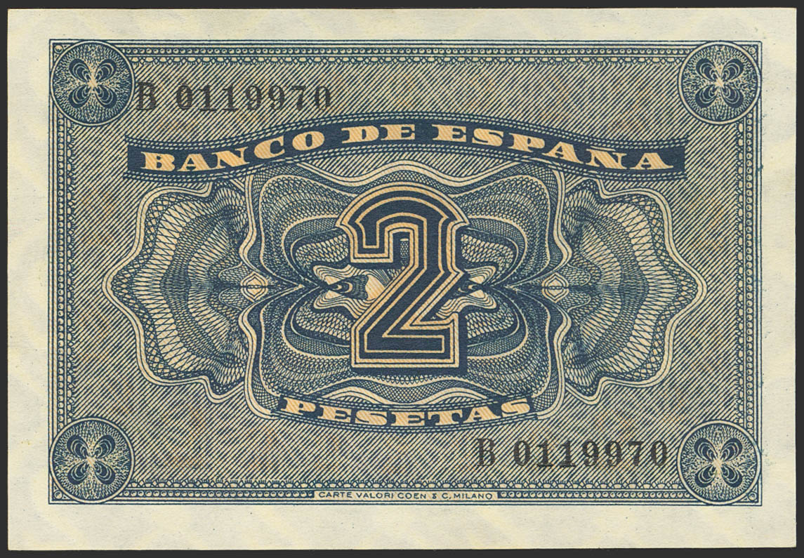 2 Pesetas. 12 de Octubre de 1937. Serie B. (Edifil 2023: 426a, Pick: 105a). Muy raro en esta excepcional calidad, apresto original. SC.