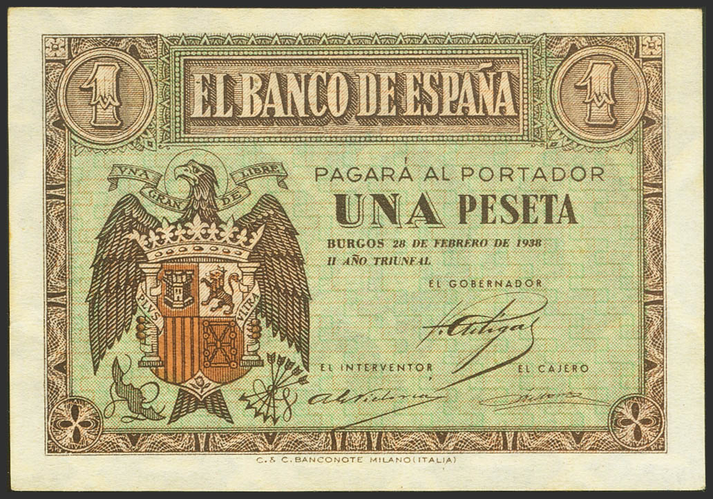 1 Peseta. 28 de Febrero de 1938. Serie A. (Edifil 2021: 427). Apresto original. SC-.
