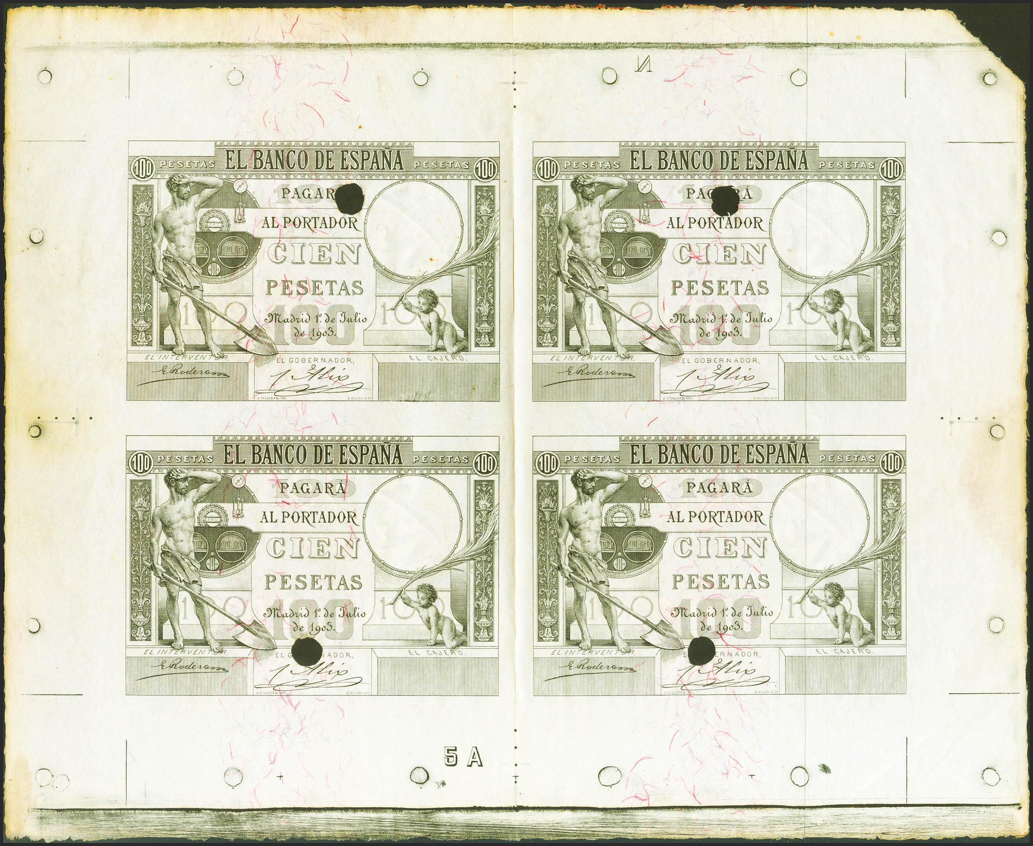 100 Pesetas Pesetas. 1 de Julio de 1903. Prueba de bloque de cuatro y taladrado. Sin numeración. (Edifil 2021: 310Pa). Muy raro, algún pliegue habitual sin importancia en piezas de este tamaño. EBC+.