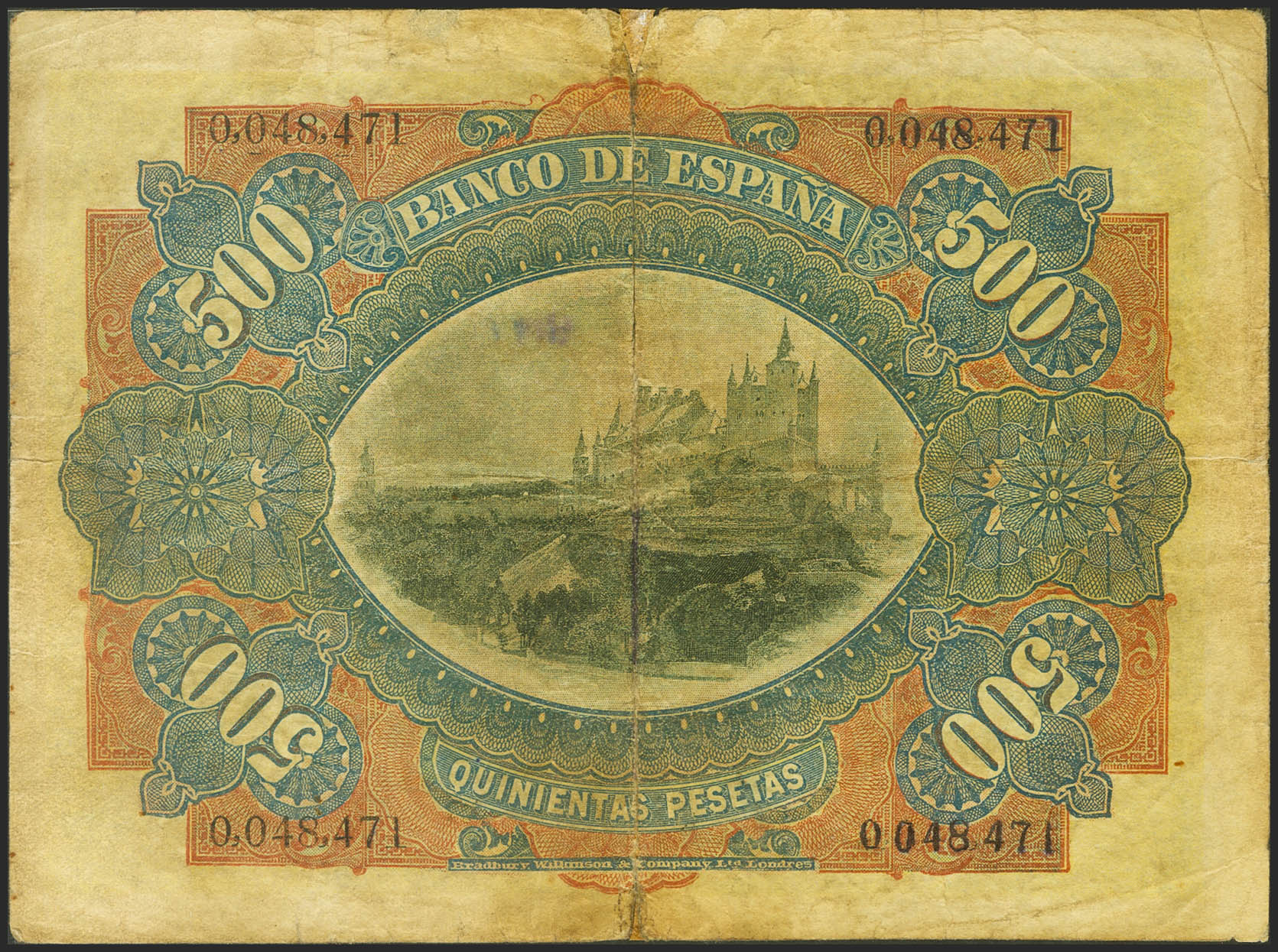 500 Pesetas. 15 de Junio de 1907. Sin serie. (Edifil 2021: 321). Inusual, reparado. MBC-.