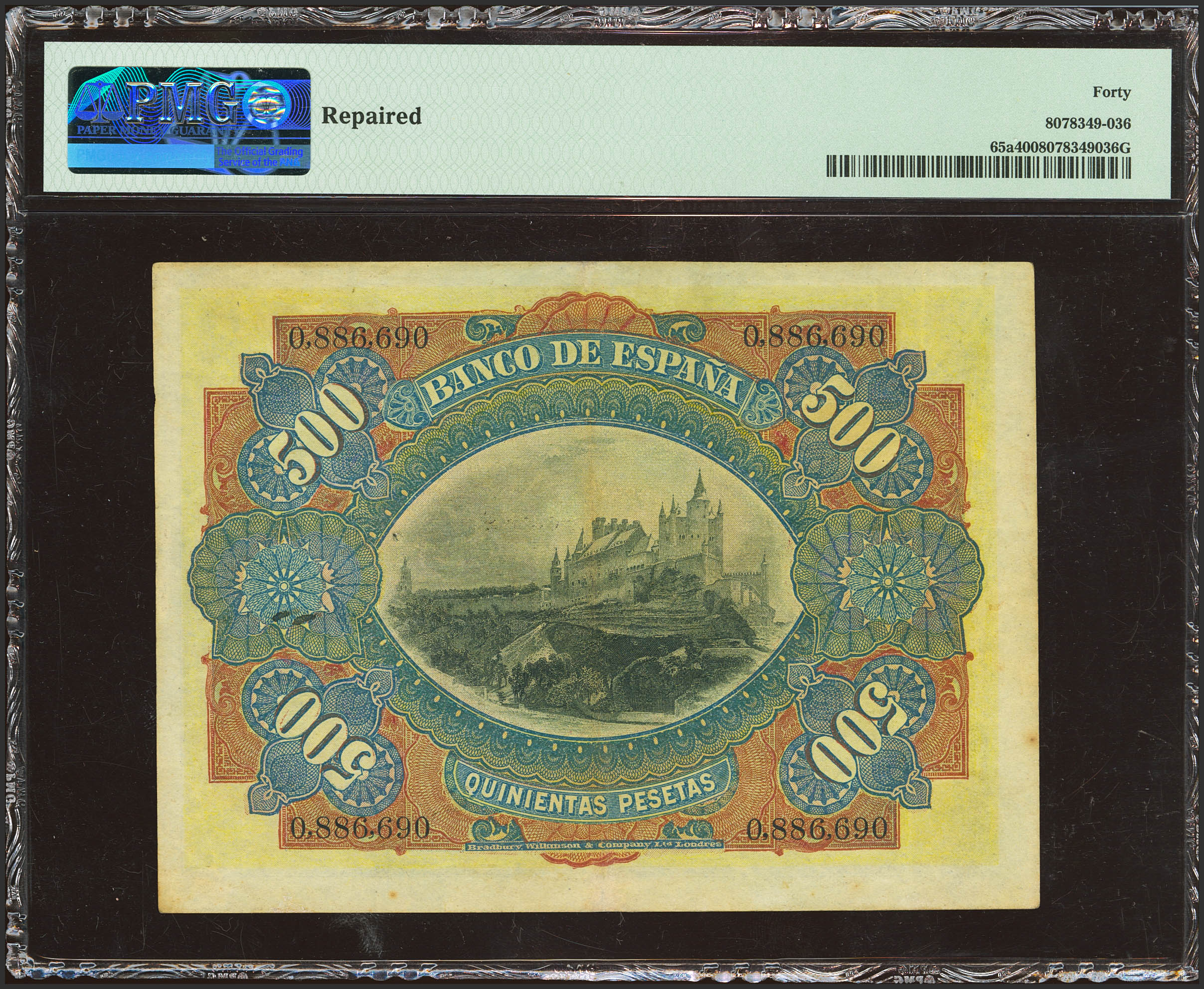 500 Pesetas. 15 de Julio de 1907. Sin serie. (Edifil 2023: 321, Pick: 65a). Raro, reparado. EBC-. Encapsulado PMG40 (repaired).