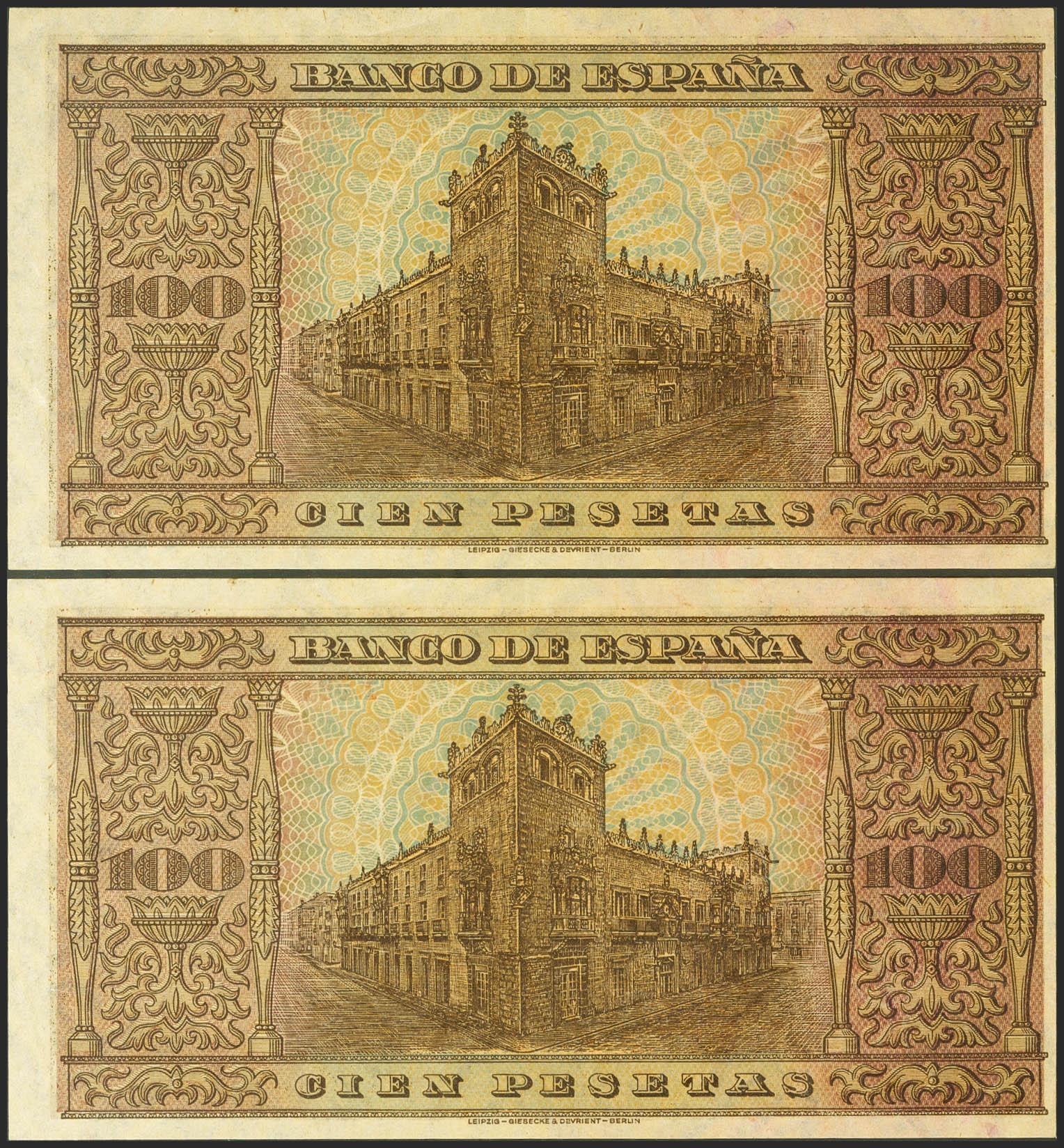 100 Pesetas. 20 de Mayo de 1938. Pareja correlativa. Serie E. (Edifil 2021: 432a). Conserva gran parte de su apresto original. EBC+.