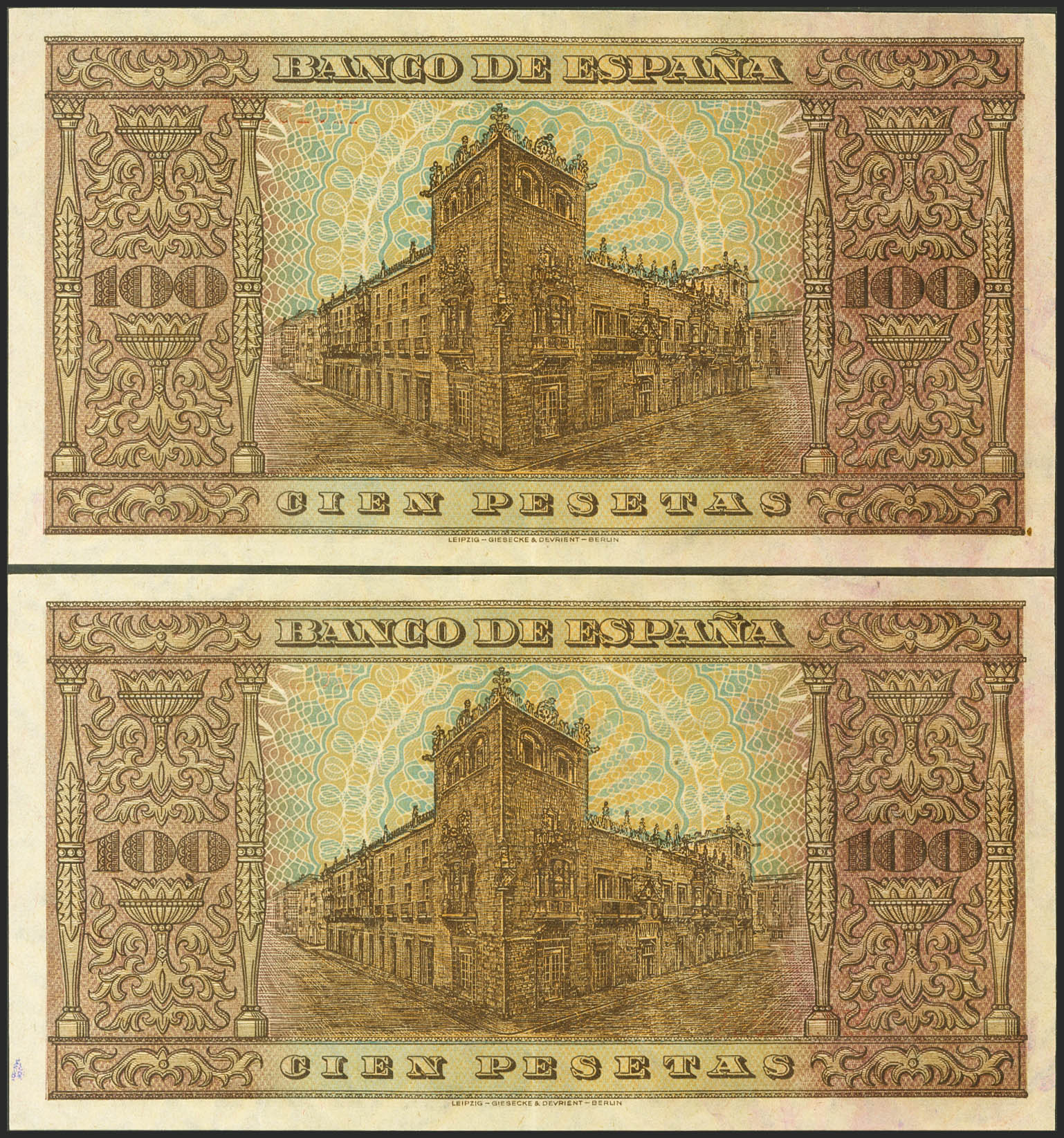 100 Pesetas. 20 de Mayo de 1938. Pareja correlativa. Serie H. (Edifil 2021: 432a). Conserva gran parte de su apresto original. EBC.