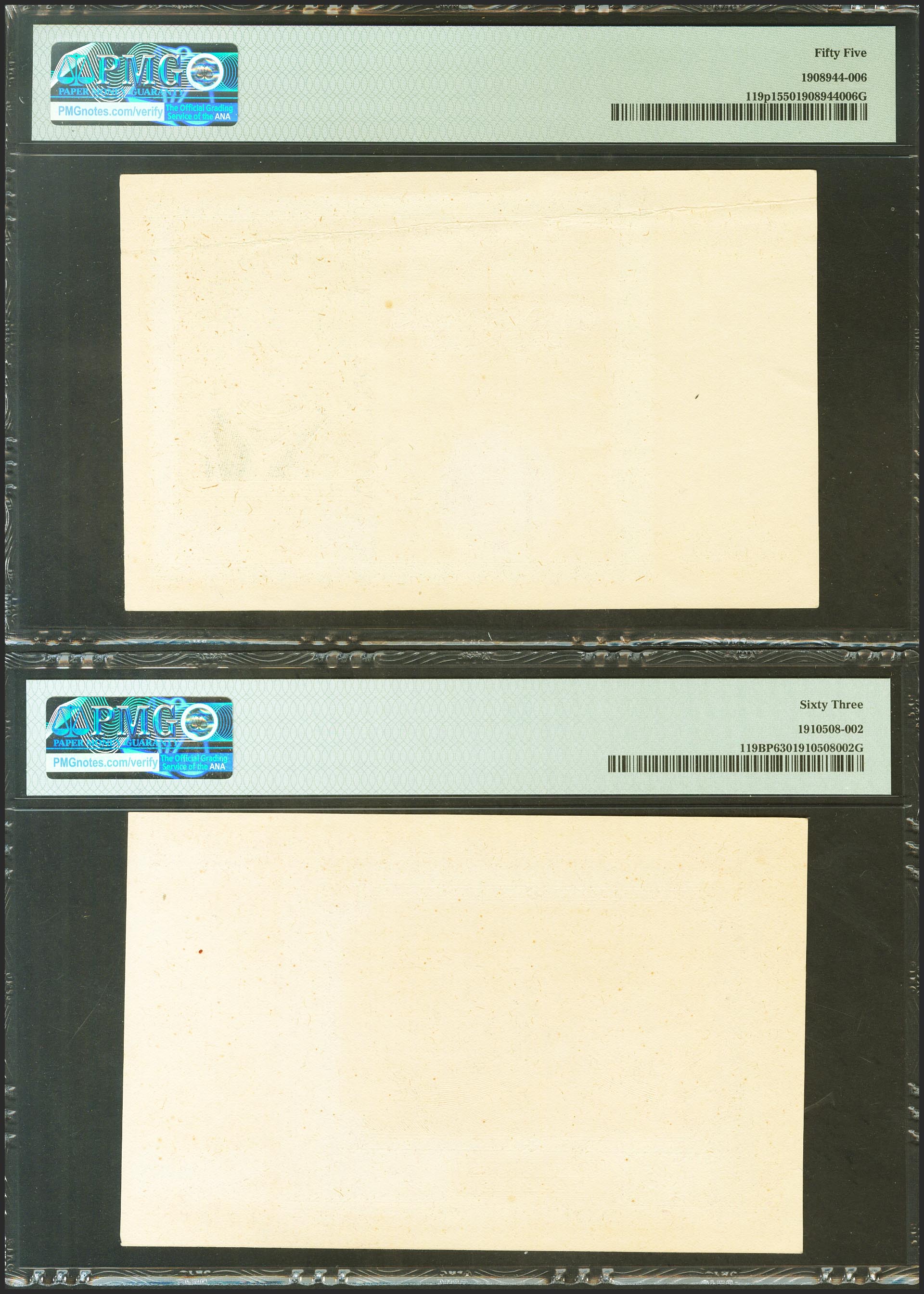 Conjunto de las pruebas de anverso y reverso del billete de 500 Pesetas emitido el 9 de Enero de 1940, el anverso sin numeración y sin firma del cajero. (Edifil 2021: 439Pa, 439Pb). Muy raras y espectaculares. SC/EBC+. Encapsuladas PMG55/63.