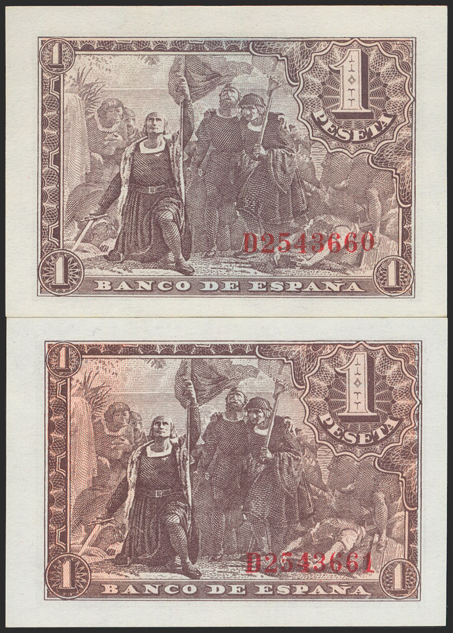 1 Peseta. 21 de Mayo de 1943. Pareja correlativa. Serie D. (Edifil 2021: 447a). Apresto original. SC.