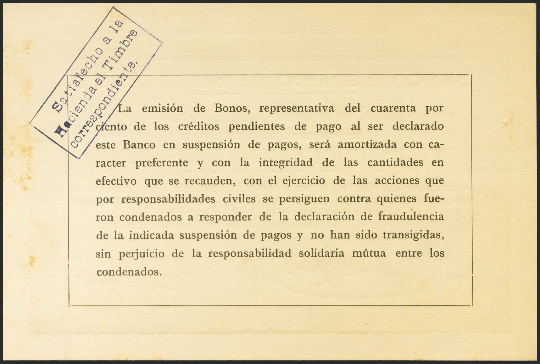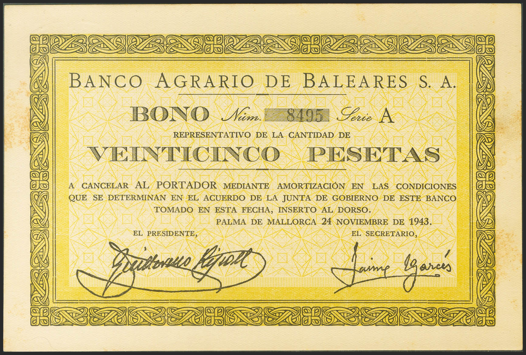 25 Pesetas. 27 de Noviembre de 1943. Banco Agrario de Baleares. Bono muy probablemente emitido con fines sustitutivos del papel moneda, Ramón Cobo Huici no lo menciona en su obra Obligaciones, vales y documentos puestos en circulación como papel moneda. SC-.