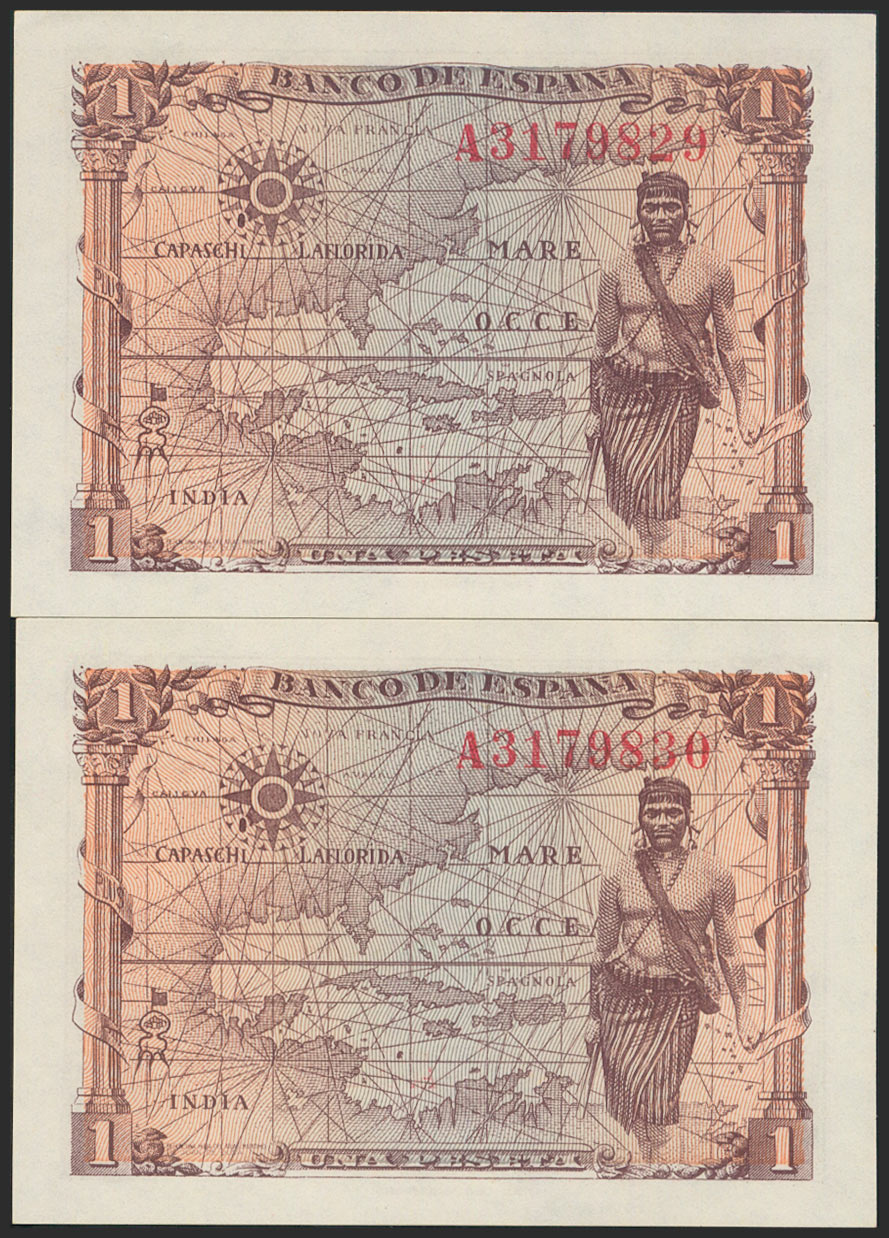 1 Peseta. 15 de Junio de 1945. Pareja correlativa. Serie A. (Edifil 2021: 448a). Apresto original. SC.