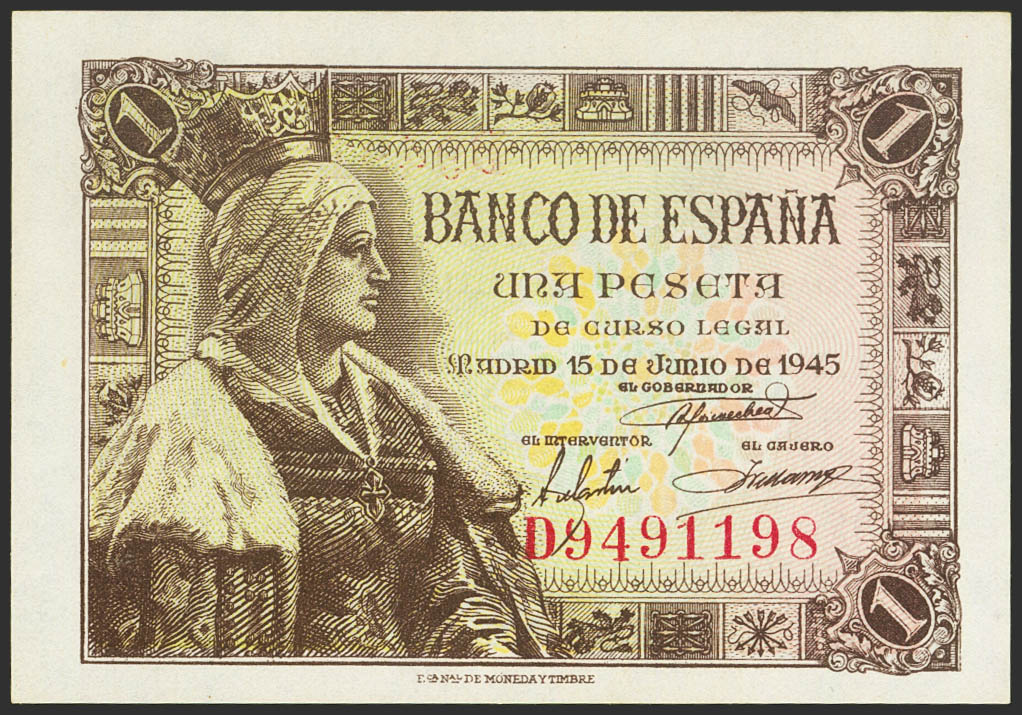 1 Peseta. 15 de Junio de 1945. Serie D. (Edifil 2021: 448a). Apresto original. SC.