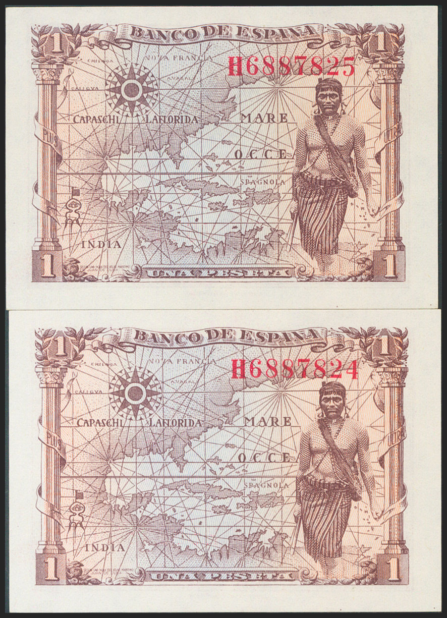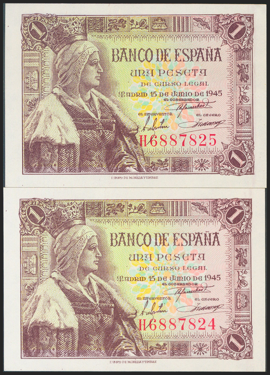 1 Peseta. 15 de Junio de 1945. Pareja correlativa. Serie H. (Edifil 2021: 448a). Apresto original. SC.