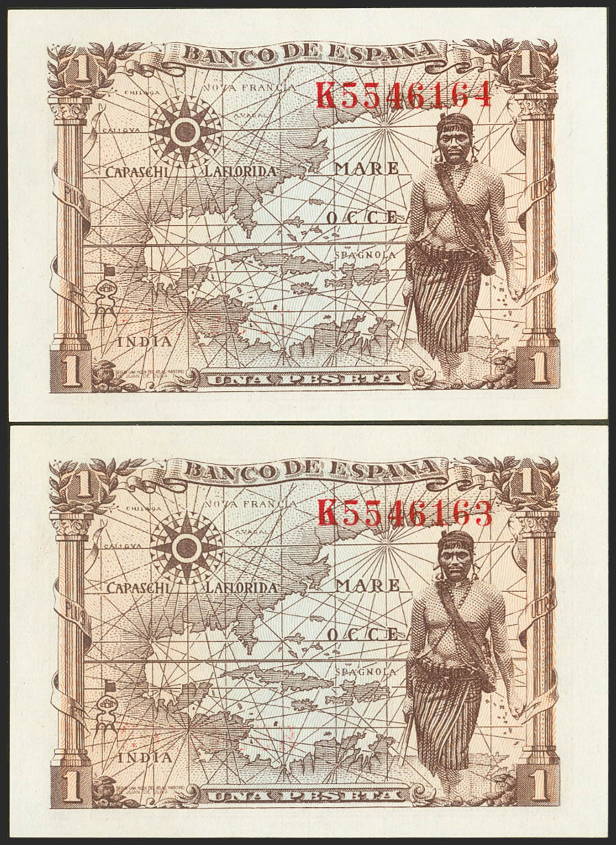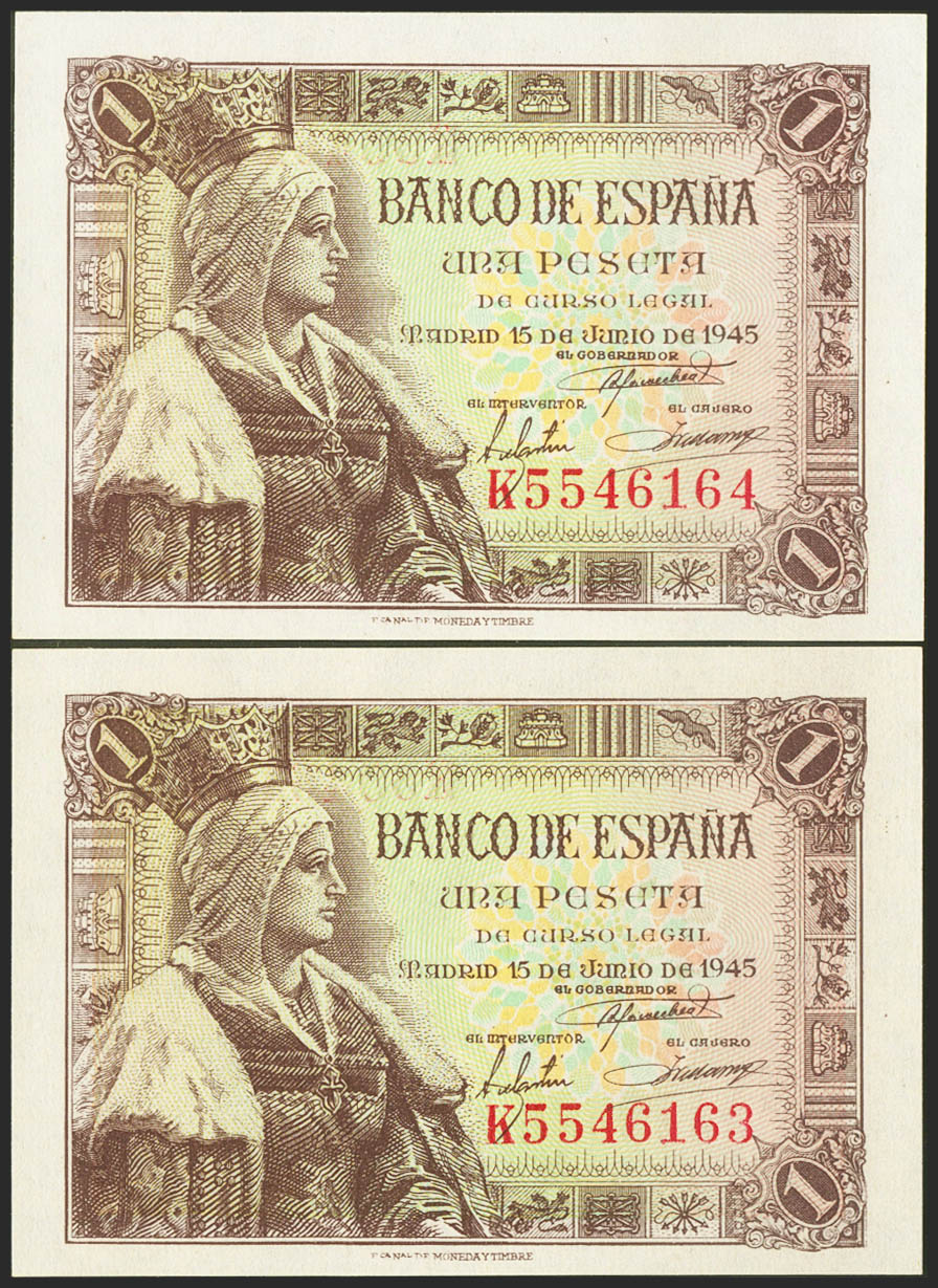 1 Peseta. 15 de Junio de 1945. Pareja correlativa. Serie K. (Edifil 2021: 448a). Apresto original. SC.