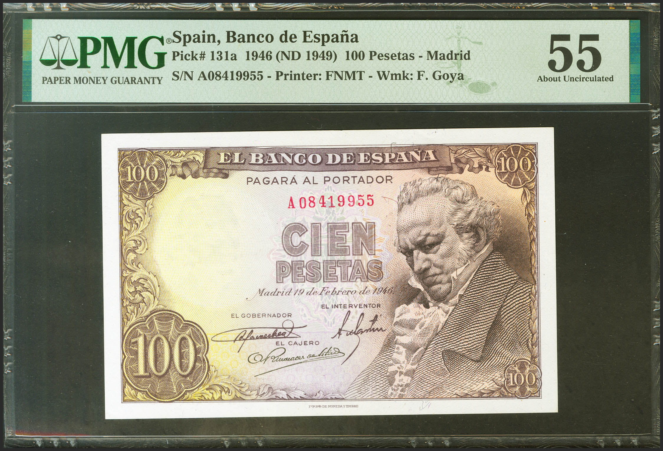 100 Pesetas. 19 de Febrero de 1946. Serie A. (Edifil 2021: 451a, Pick: 131a). EBC+. Encapsulado PMG55.