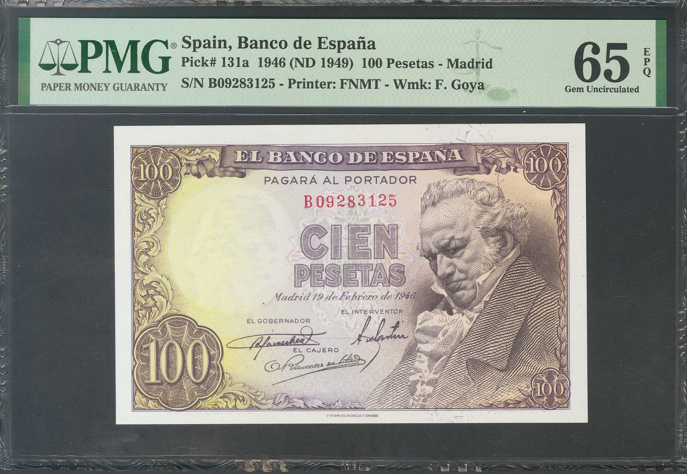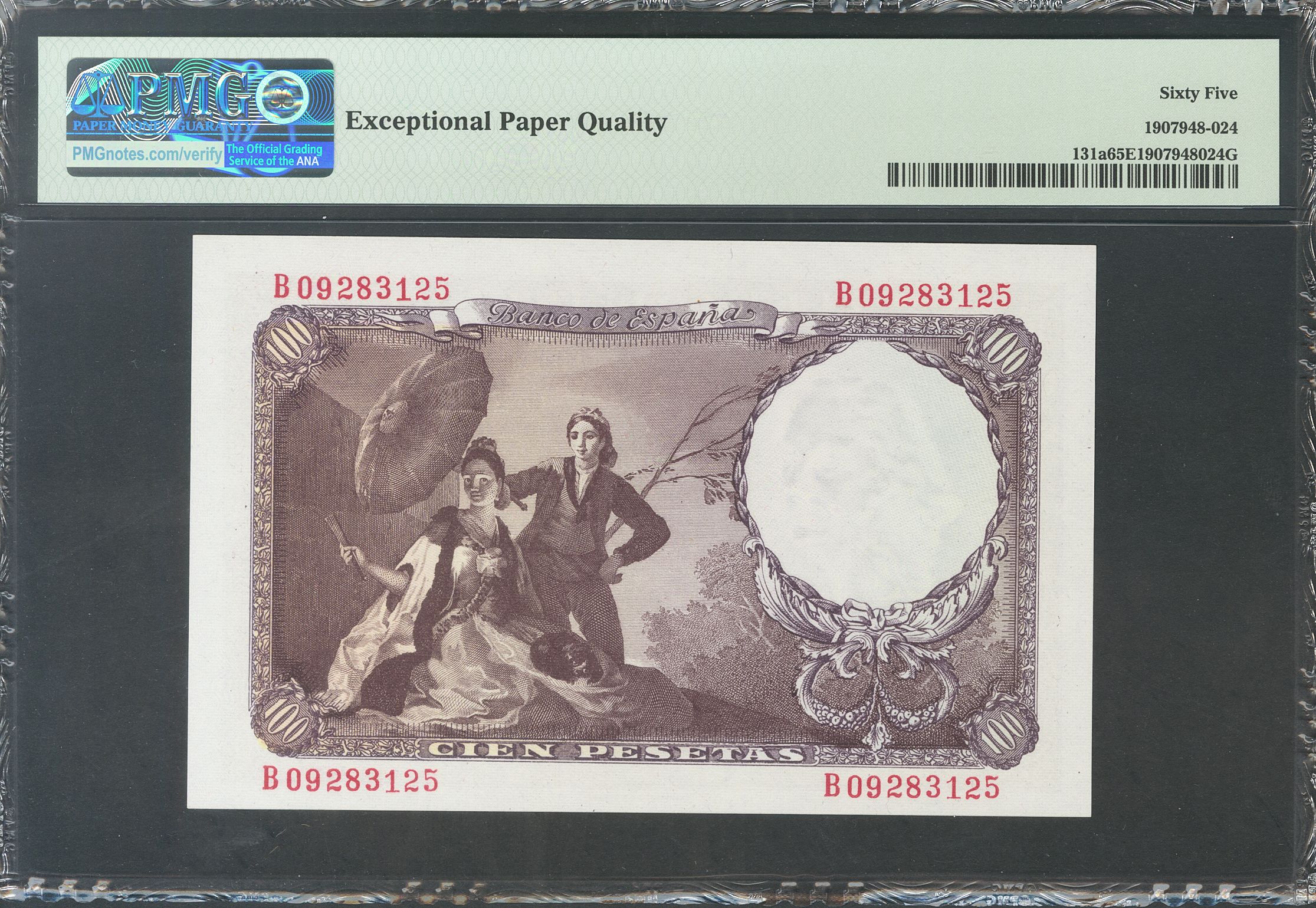 100 Pesetas. 19 de Febrero de 1946. Pareja correlativa. Serie B. (Edifil 2017: 451b). Conserva todo su apresto original. SC. Encapsulados PMG65EPQ y 66EPQ, respectivamente.