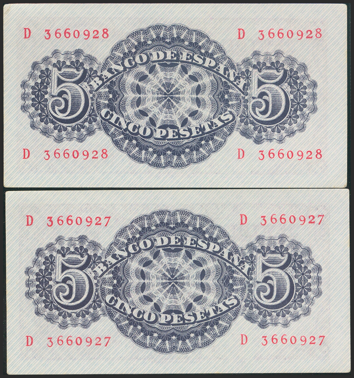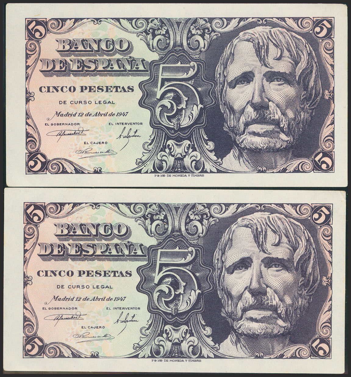 5 Pesetas. 12 de Abril de 1947. Pareja correlativa. Serie D. (Edifil 2021: 454a). Apresto original. SC-.