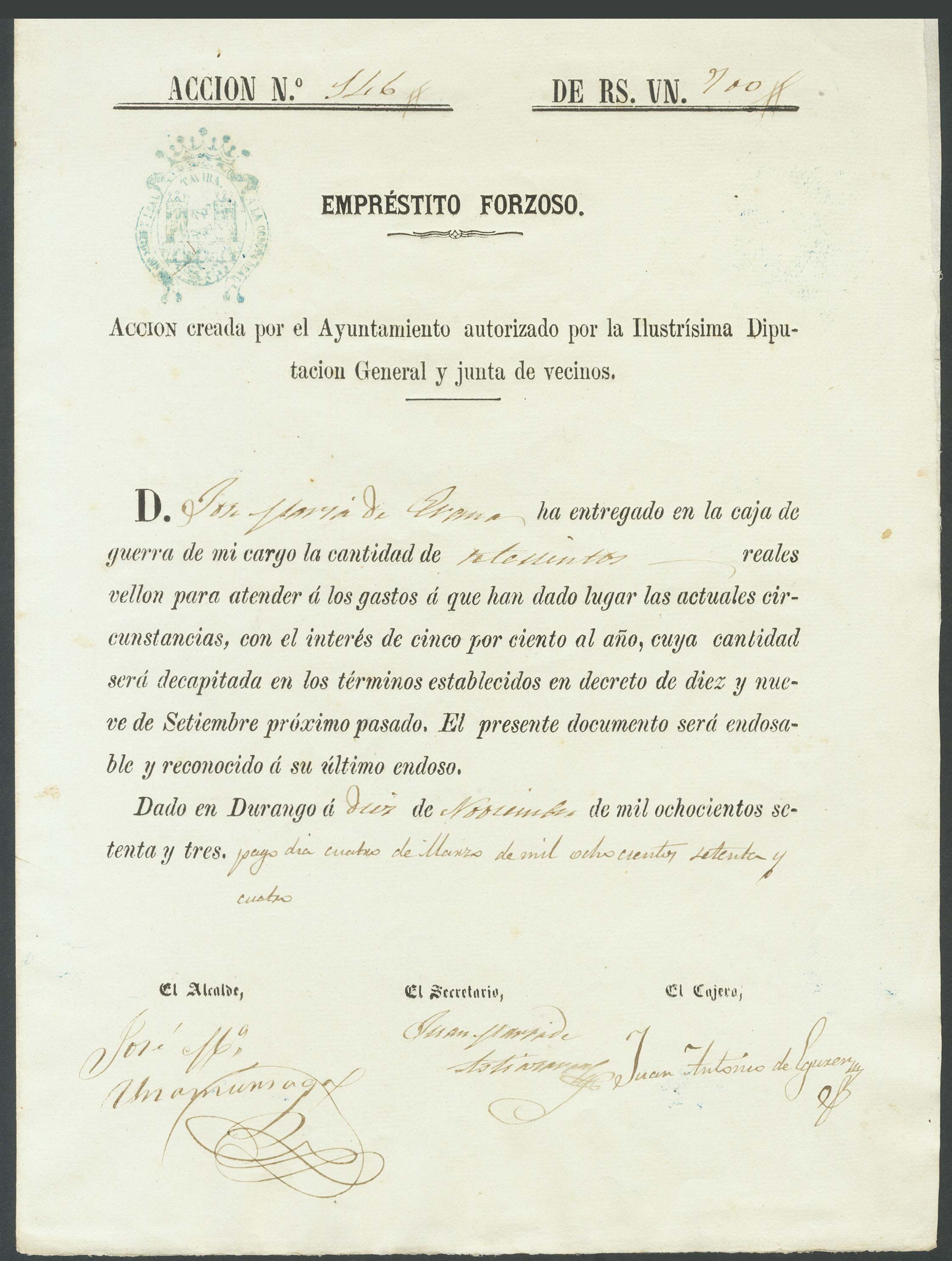 700 Reales (Empréstito Forzoso endosable). 10 de Noviembre de 1874. Emitido por el Ayuntamiento de Durango (Vizcaya) para el sufragio de la III Guerra Carlista. Rarísimo. SC-.