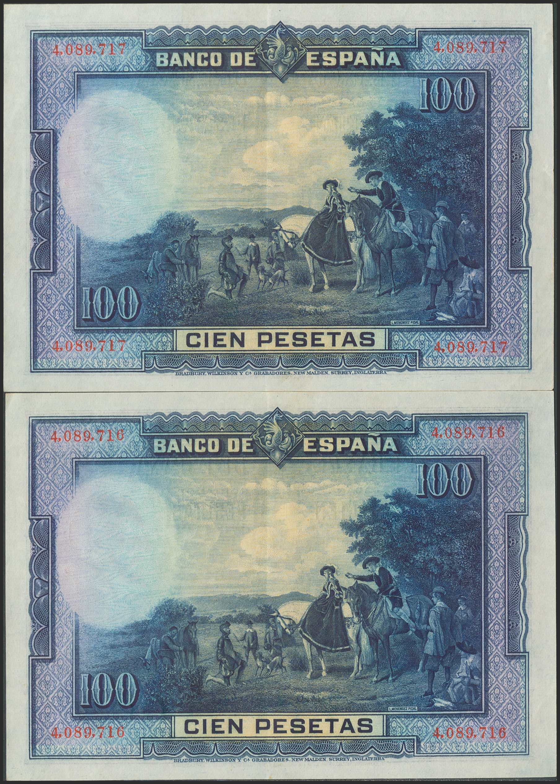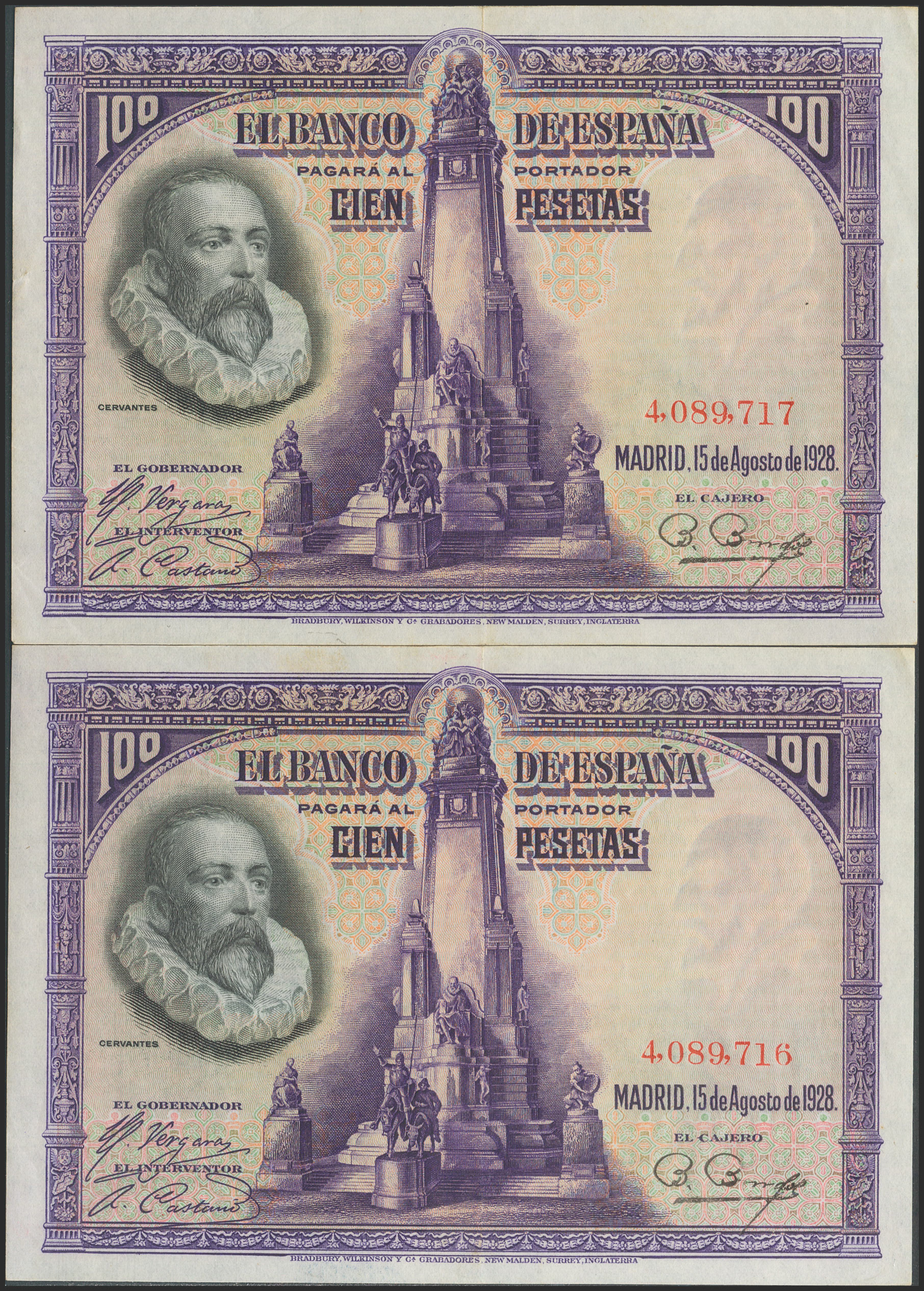 100 Pesetas. 15 de Agosto de 1928. Pareja correlativa. Sin serie. (Edifil 2021: 355). Conserva parte del apresto original. EBC.