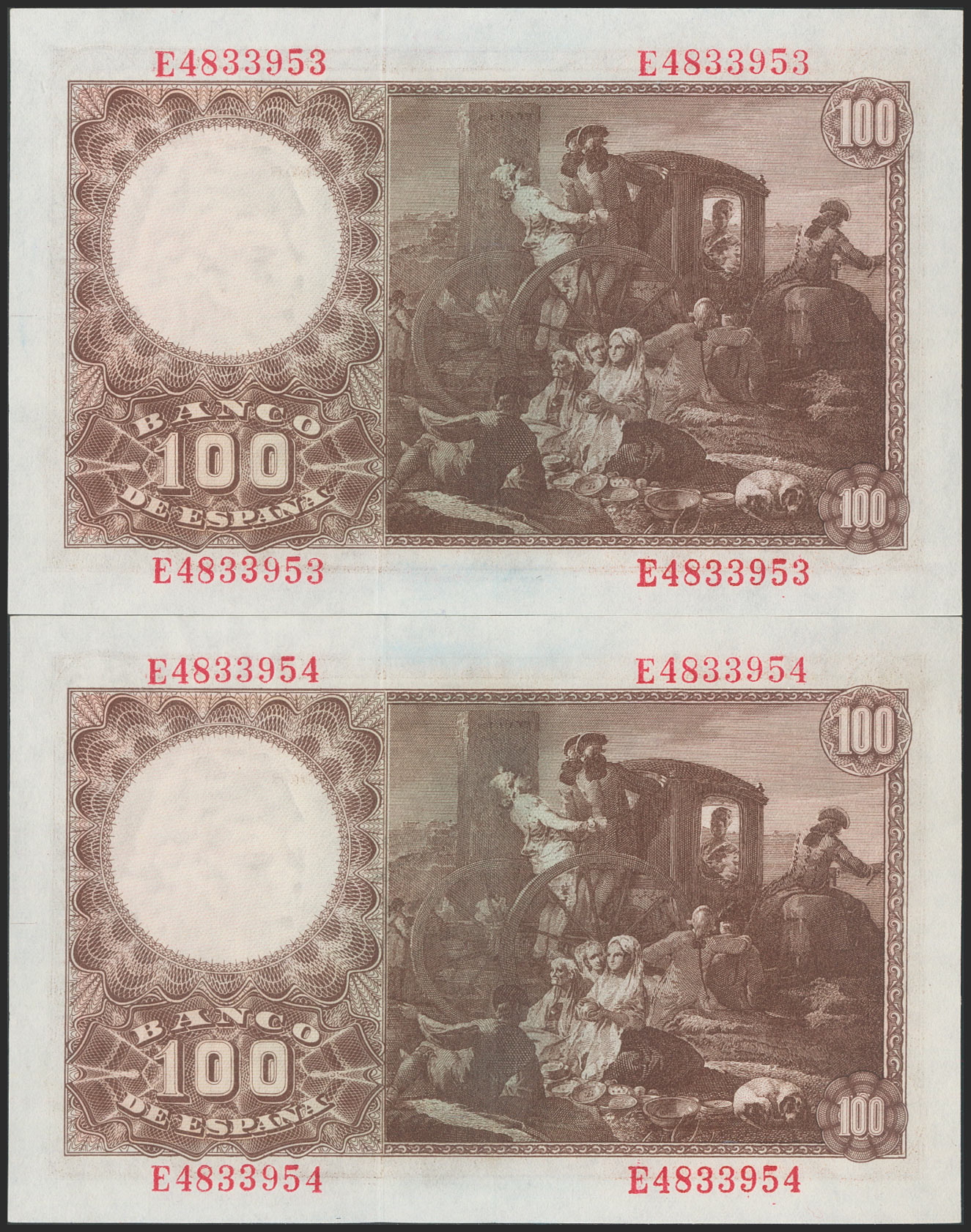 100 Pesetas. 2 de Mayo de 1948. Pareja correlativa. Serie E. (Edifil 2021: 456a). Conserva gran parte del apresto original. EBC+.
