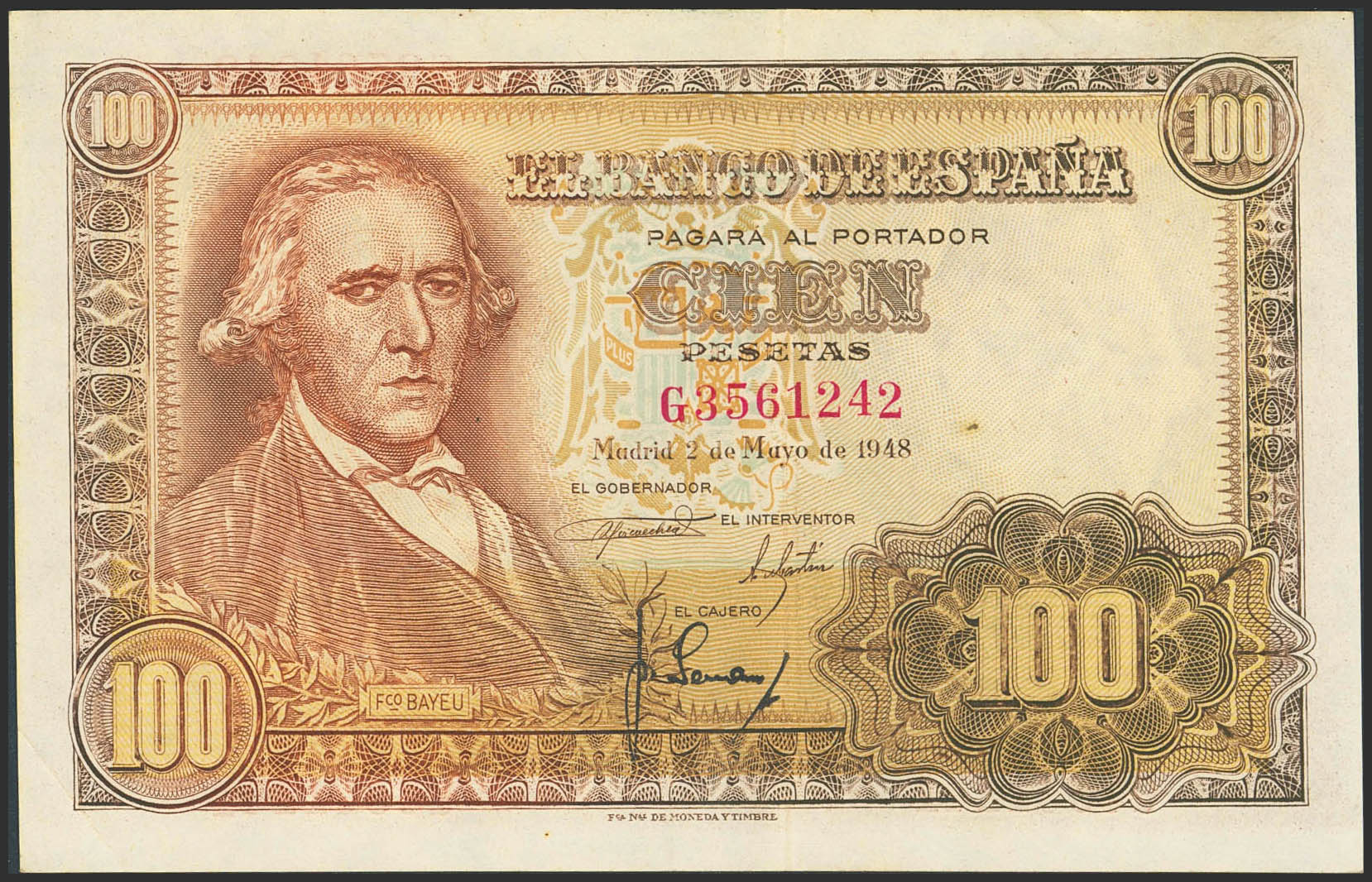 100 Pesetas. 2 de Mayo de 1948. Serie G. (Edifil 2021: 456a). Conserva gran parte del apresto original. EBC.