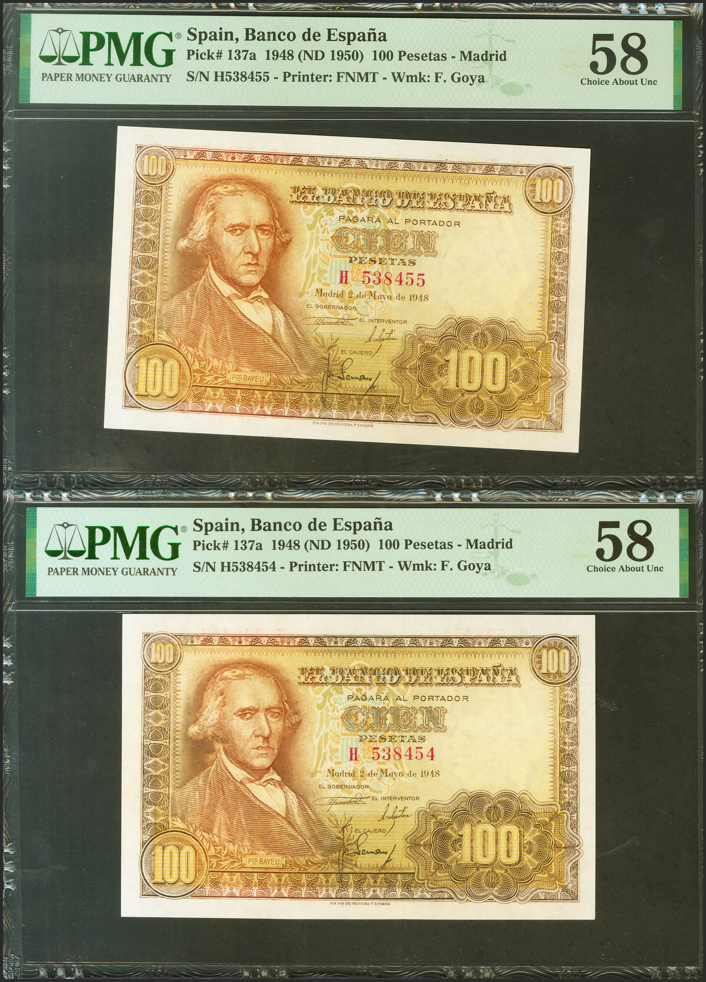 100 Pesetas. 2 de Mayo de 1948. Pareja correlativa. Serie H. (Edifil 2021: 456a, Pick: 137a). EBC++. Encapsulados PMG58, ambos.