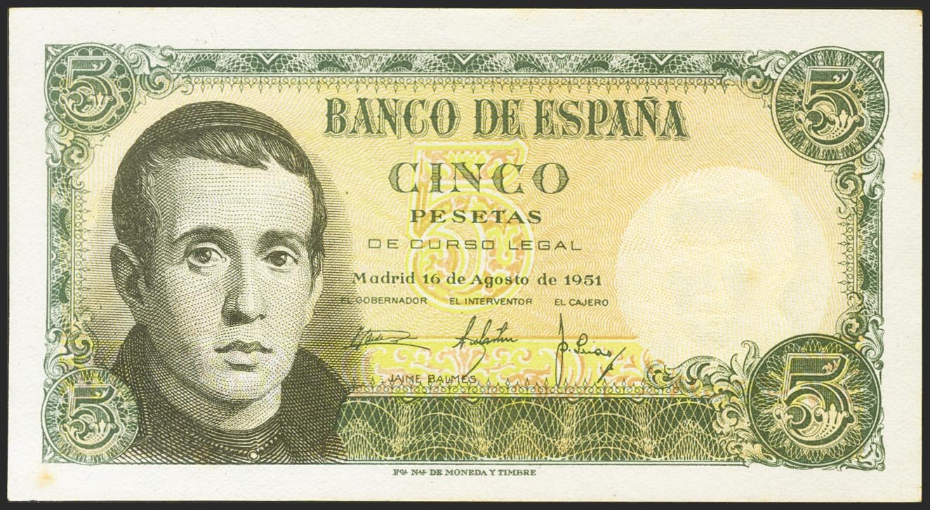 5 Pesetas. 16 de Agosto de 1951. Sin serie. (Edifil 2021: 459). Puntito del tiempo en la esquina inferior izquierda y apresto original. SC-.