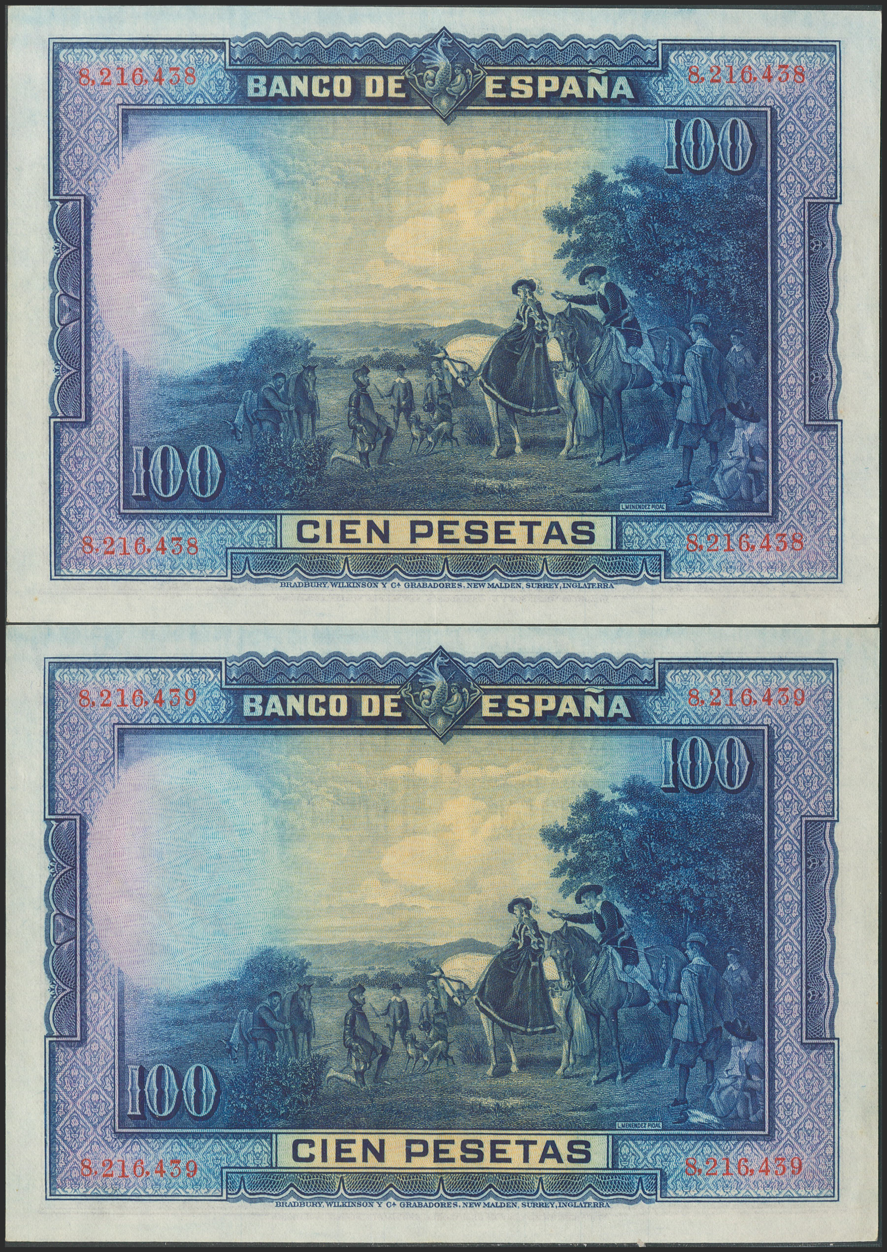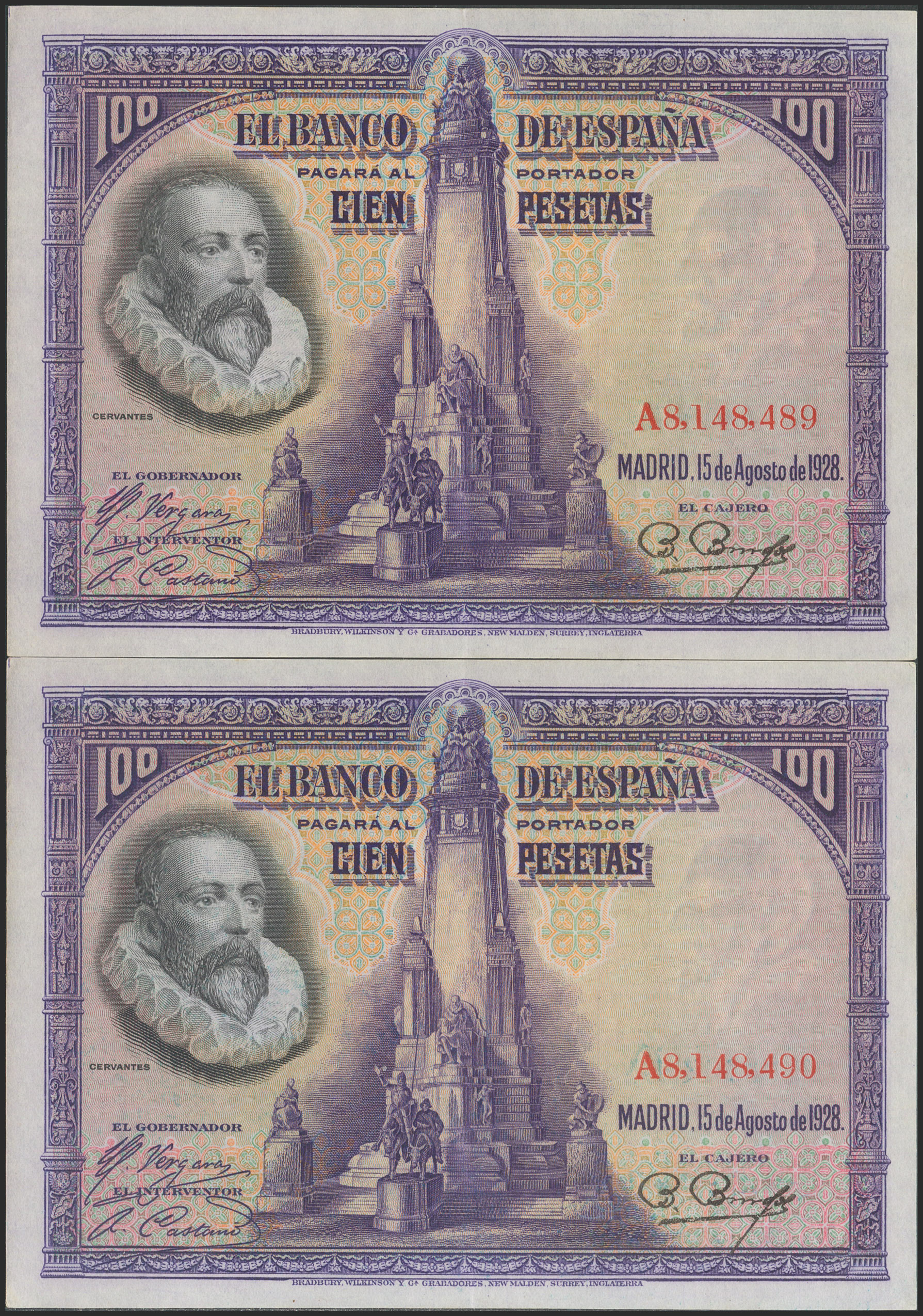 100 Pesetas. 15 de Agosto de 1928. Pareja correlativa. Serie A. (Edifil 2021: 355a). Conserva gran parte del apresto original. EBC+.