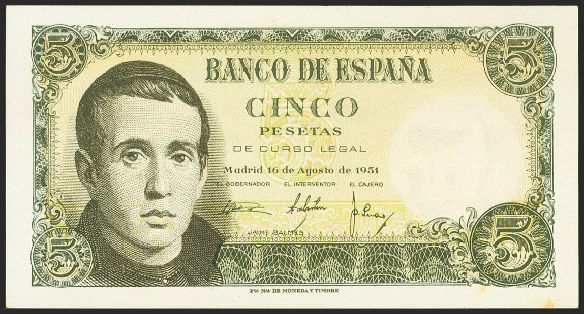 5 Pesetas. 16 de Agosto de 1951. Serie 1H. (Edifil 2021: 459a). Apresto original. EBC+.