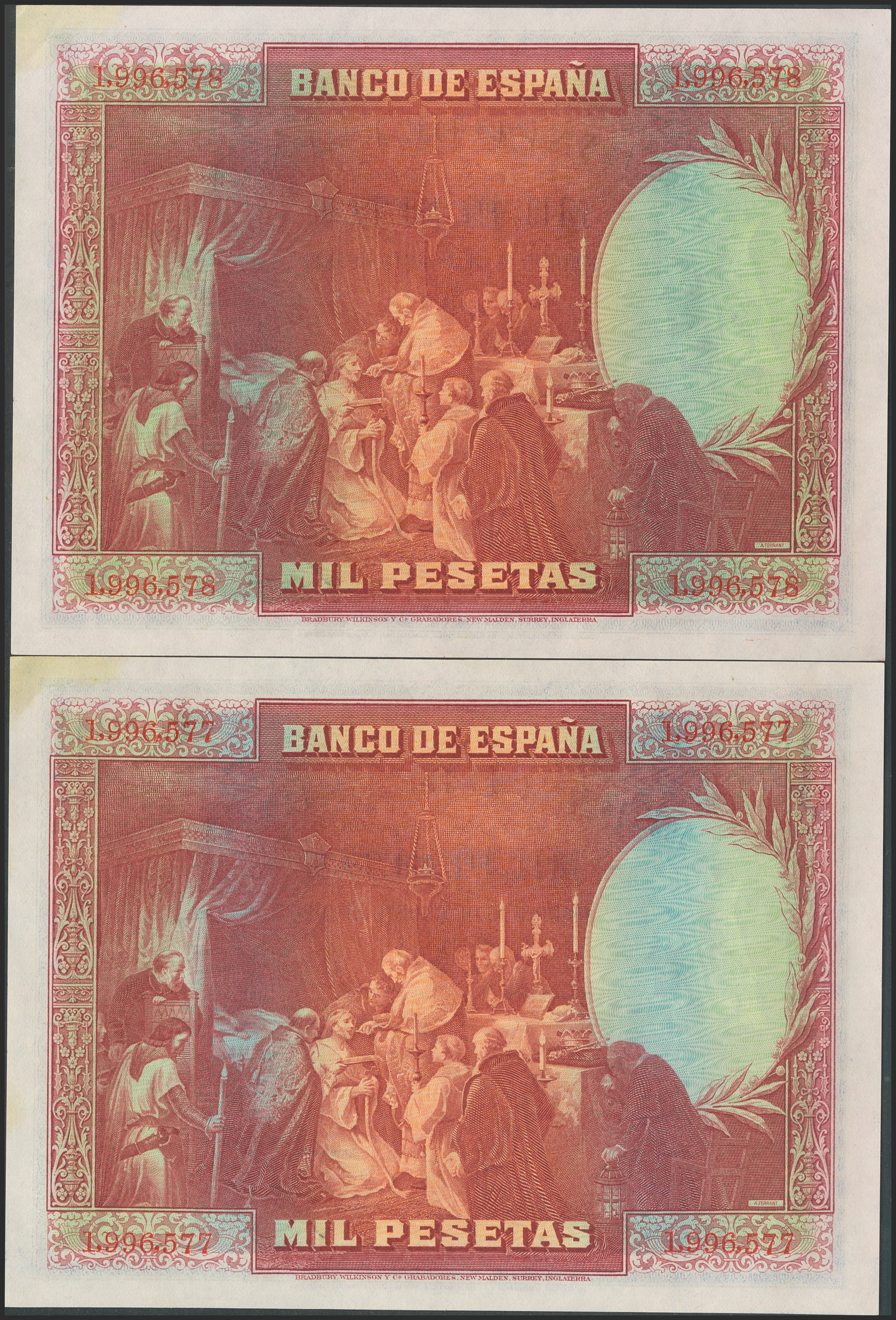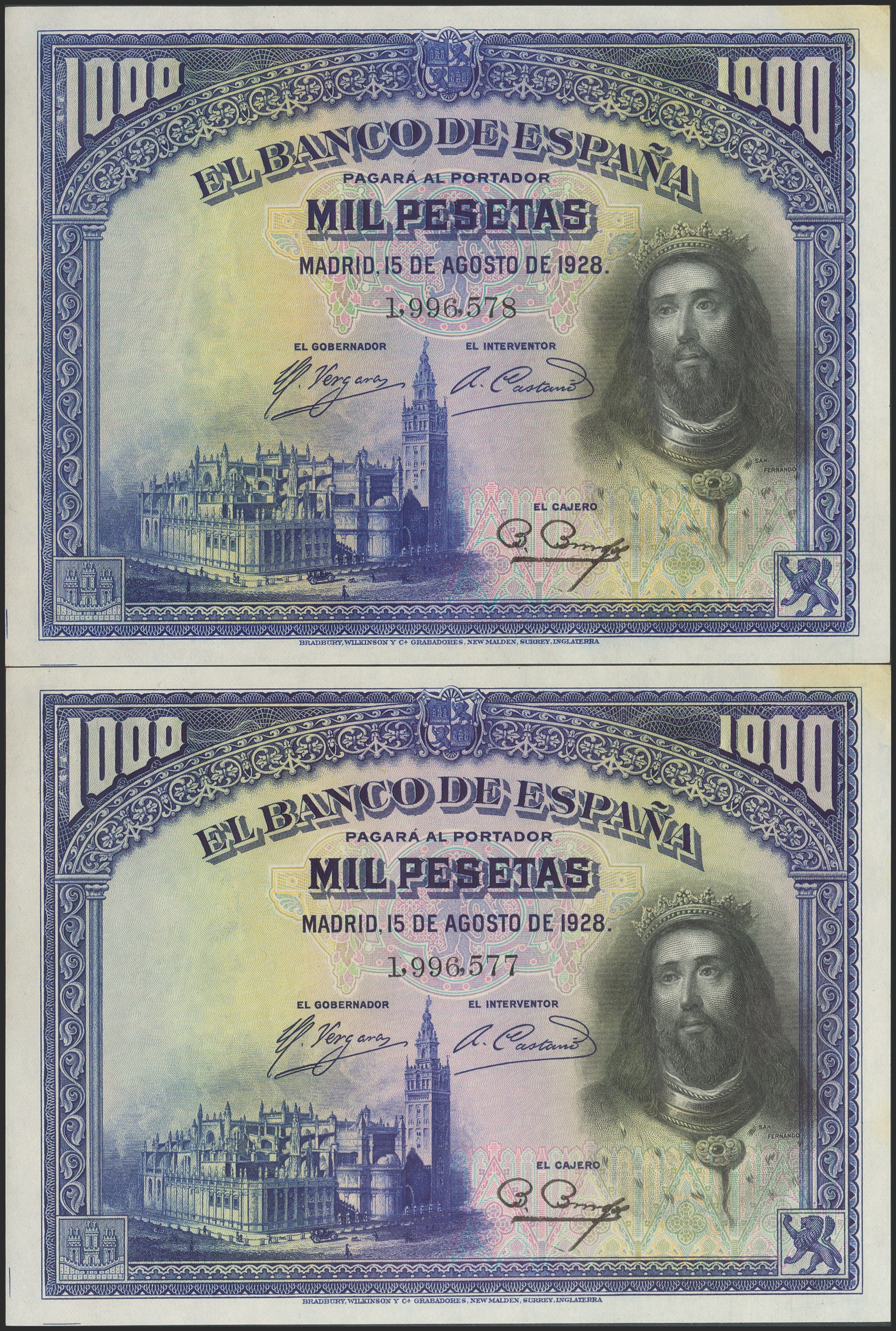 1000 Pesetas. 15 de Agosto de 1928. Pareja correlativa. Sin serie. (Edifil 2017: 357). Conserva todo su apresto original. SC-.