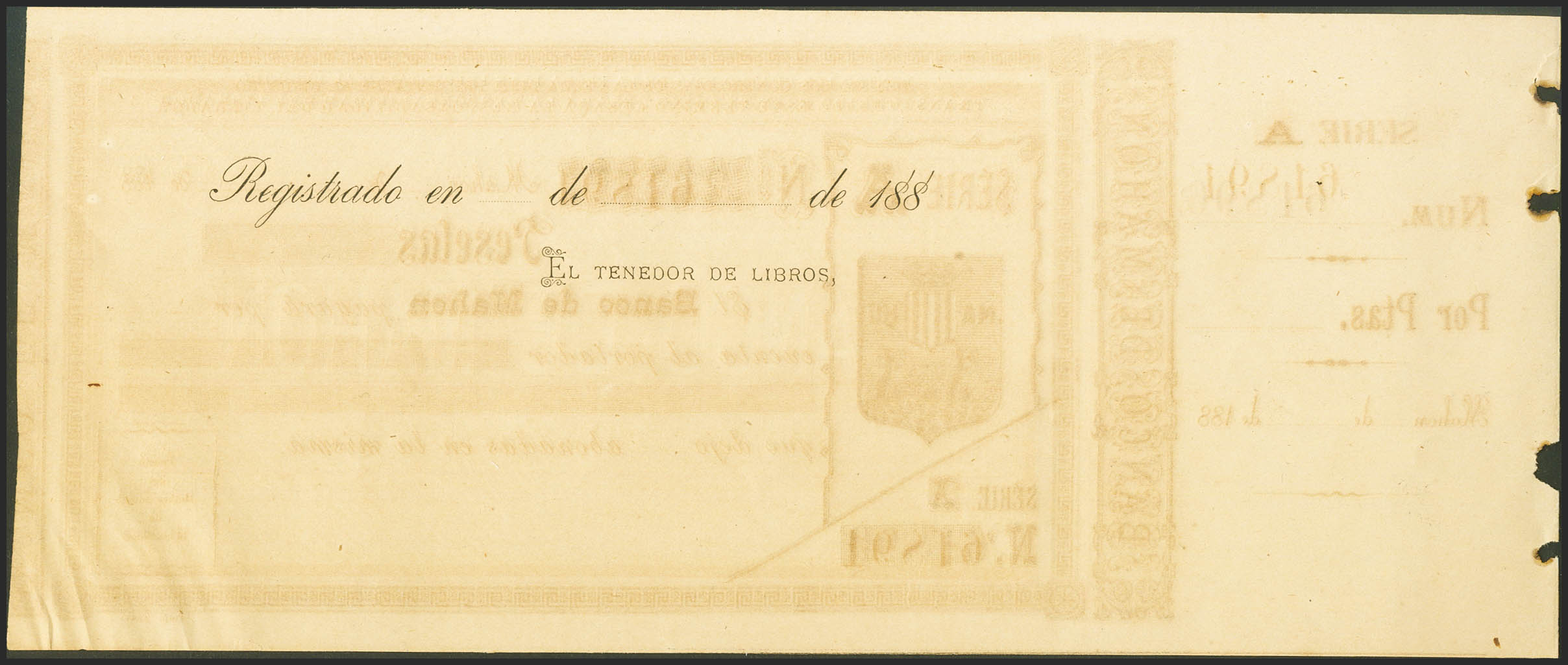 Talón sin completar emitido a finales del siglo XIX (188_) numerado y con la serie A por el Banco de Mahón. Muy probablemente emitido con fines sustitutivos de papel moneda. SC-.