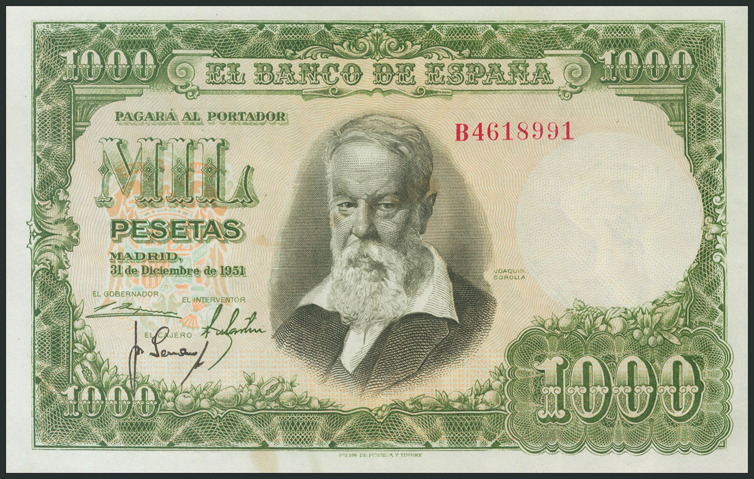 1000 Pesetas. 31 de Diciembre de 1951. Serie B. (Edifil 2017: 463a). Presenta todo su apresto original, manchita en el margen inferiror. EBC-.