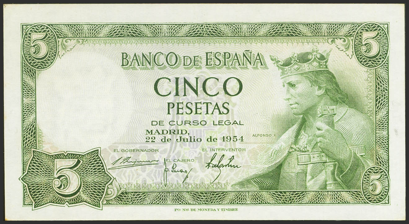 5 Pesetas. 22 de Julio de 1954. Serie M. (Edifil 2021: 466a). Conserva todo su apresto original, sombritas del tiempo. EBC+.