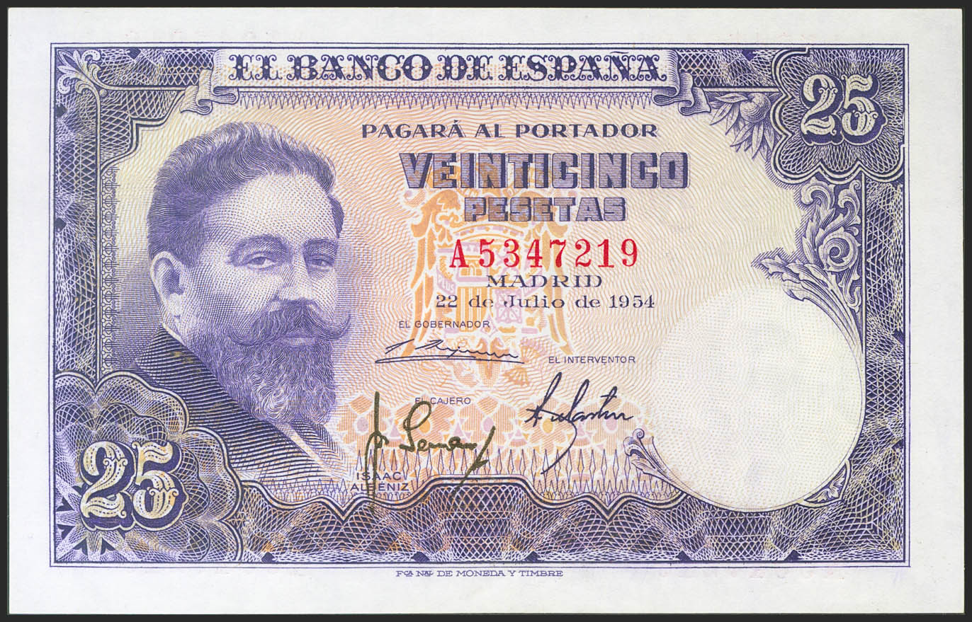 25 Pesetas. 22 de Julio de 1954. Serie A. (Edifil 2021: 467a). Conserva gran parte de su apresto original. EBC+.