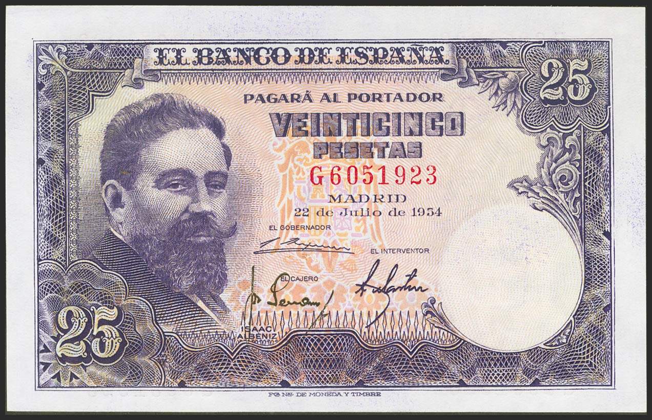 25 Pesetas. 22 de Julio de 1954. Serie G. (Edifil 2021: 467a). Conserva todo su apresto original. SC.