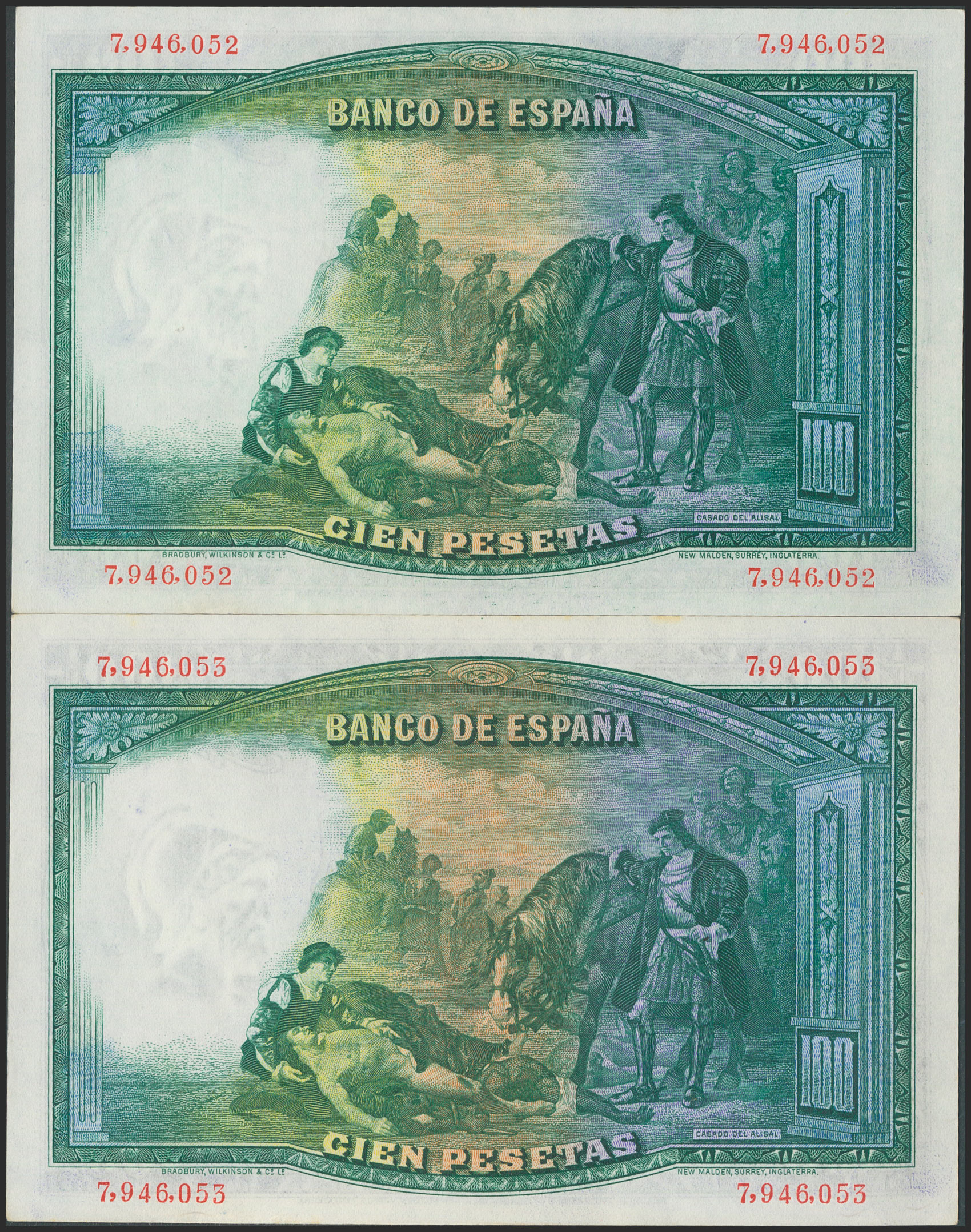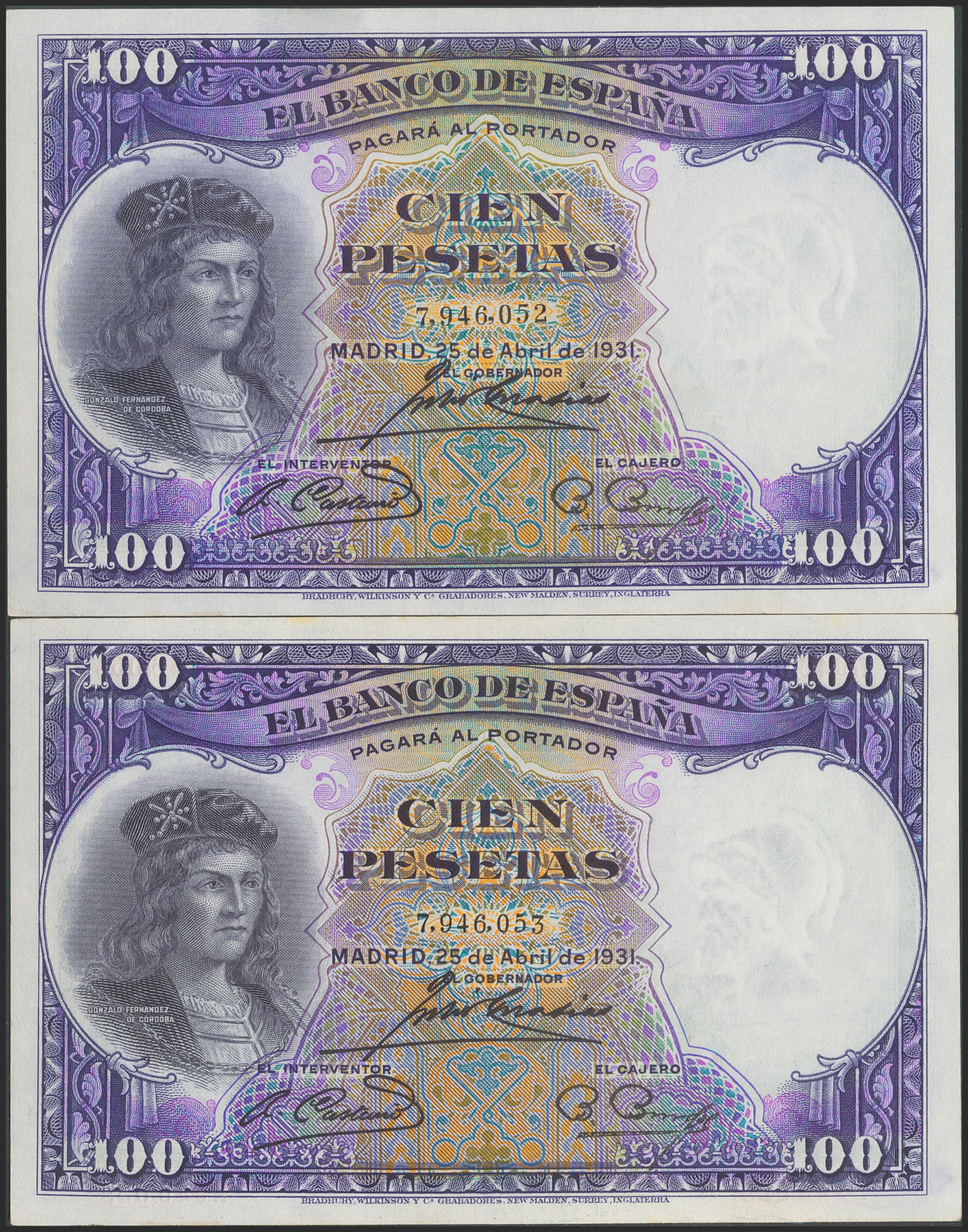 100 Pesetas. 25 de Abril de 1931. Parreja correlativa. Sin serie. (Edifil 2017: 360). Conserva todo su apresto original. SC-.