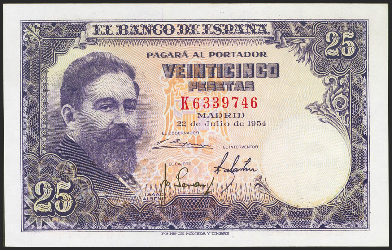 25 Pesetas. 22 de Julio de 1954. Serie K. (Edifil 2021: 467a). Conserva todo su apresto original. SC.