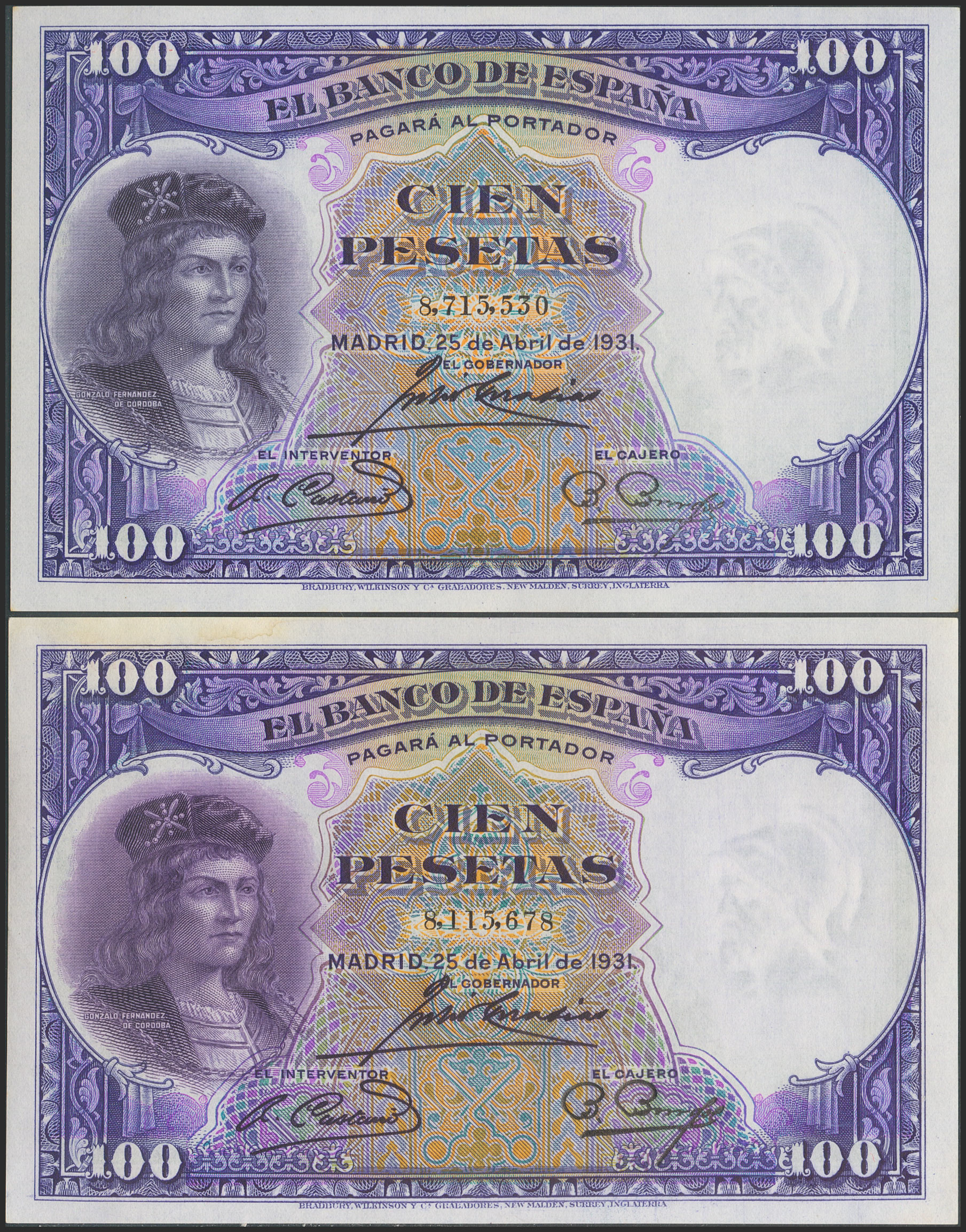 100 Pesetas. 25 de Abril de 1931. Pareja correlativa. Sin serie. (Edifil 2021: 360). Apresto original. SC-/EBC.