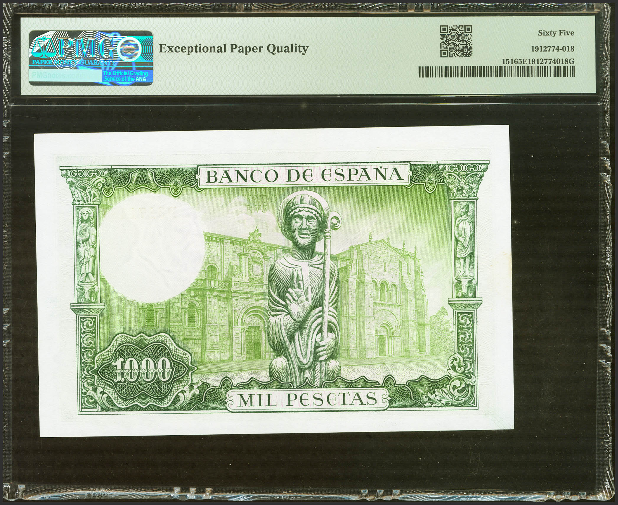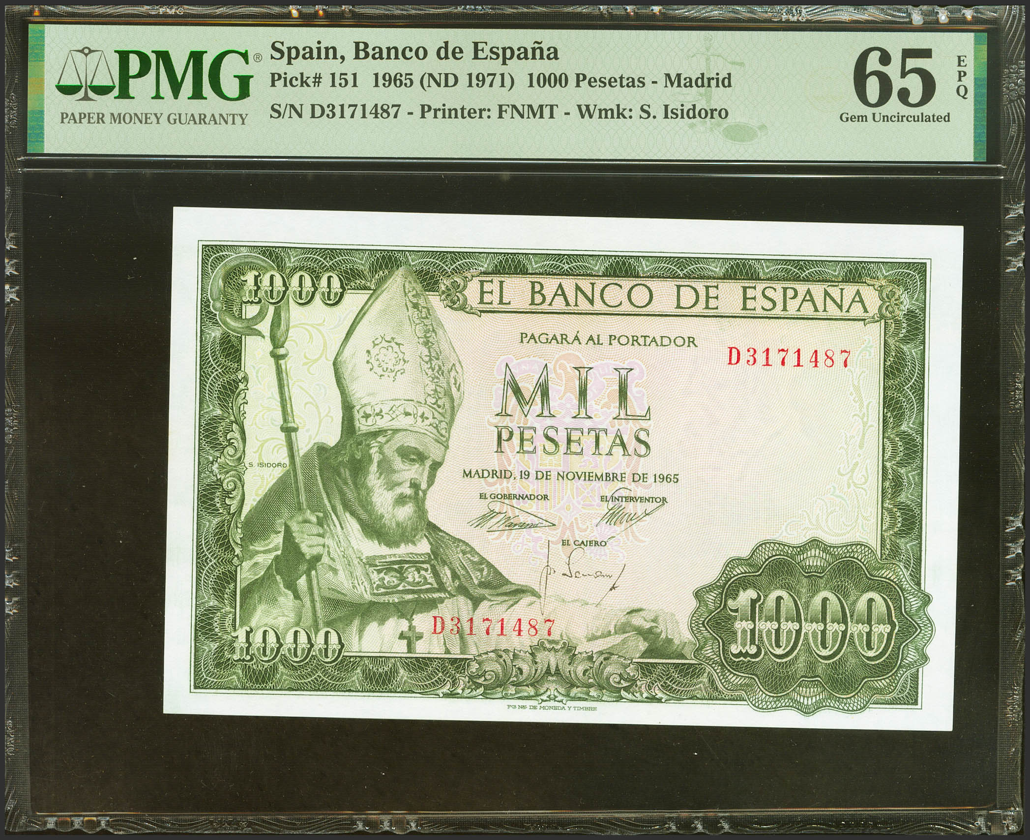 1000 Pesetas. 19 de Noviembre de 1965. Serie D. (Edifil 2021: 471b, Pick: 151). Raro en esta excepcional calidad, apresto original. SC. Encapsulado PMG65EPQ.