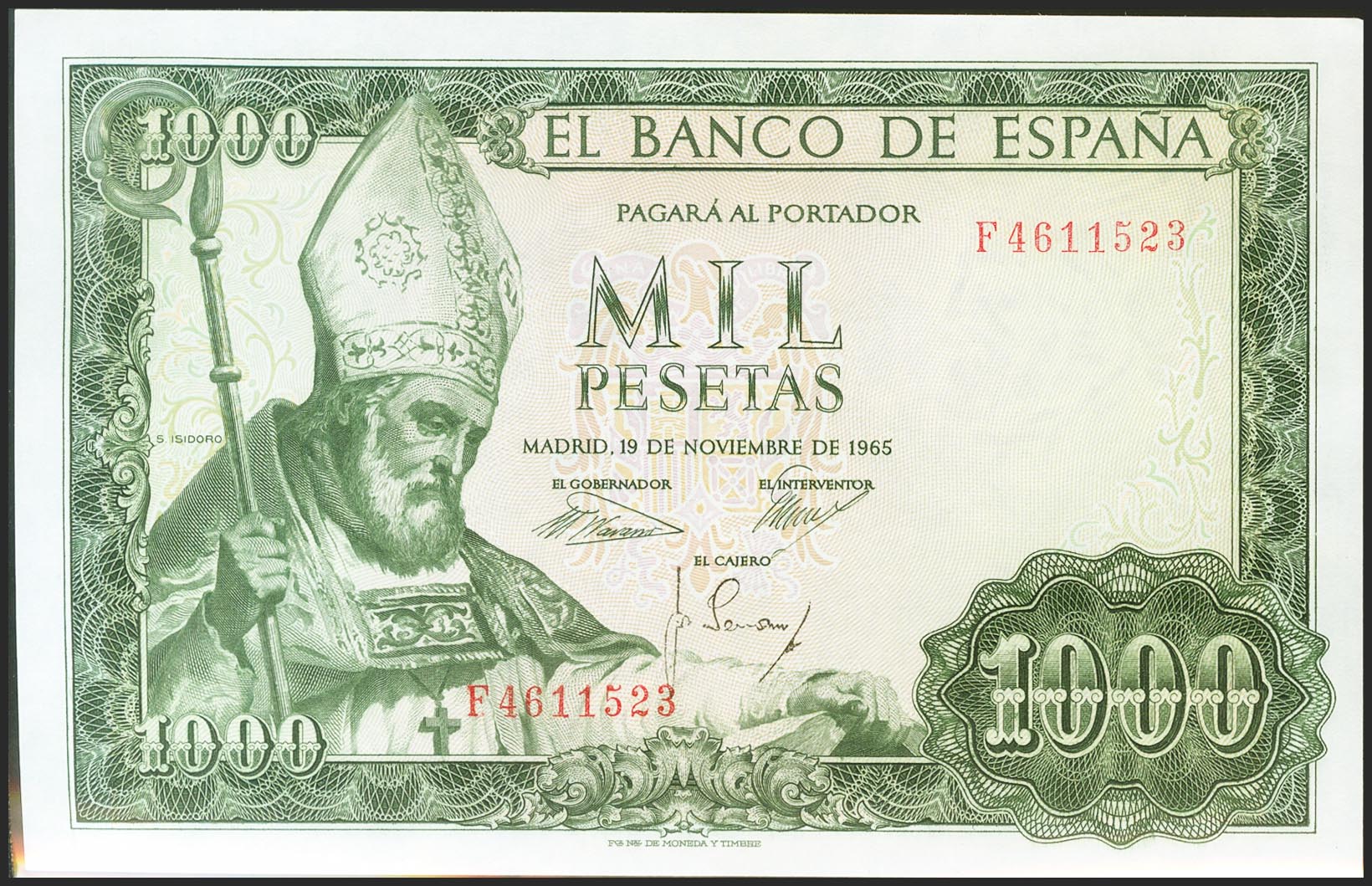 1000 Pesetas. 19 de Noviembre de 1965. Serie F. (Edifil 2021: 471b). Apresto original. SC-.