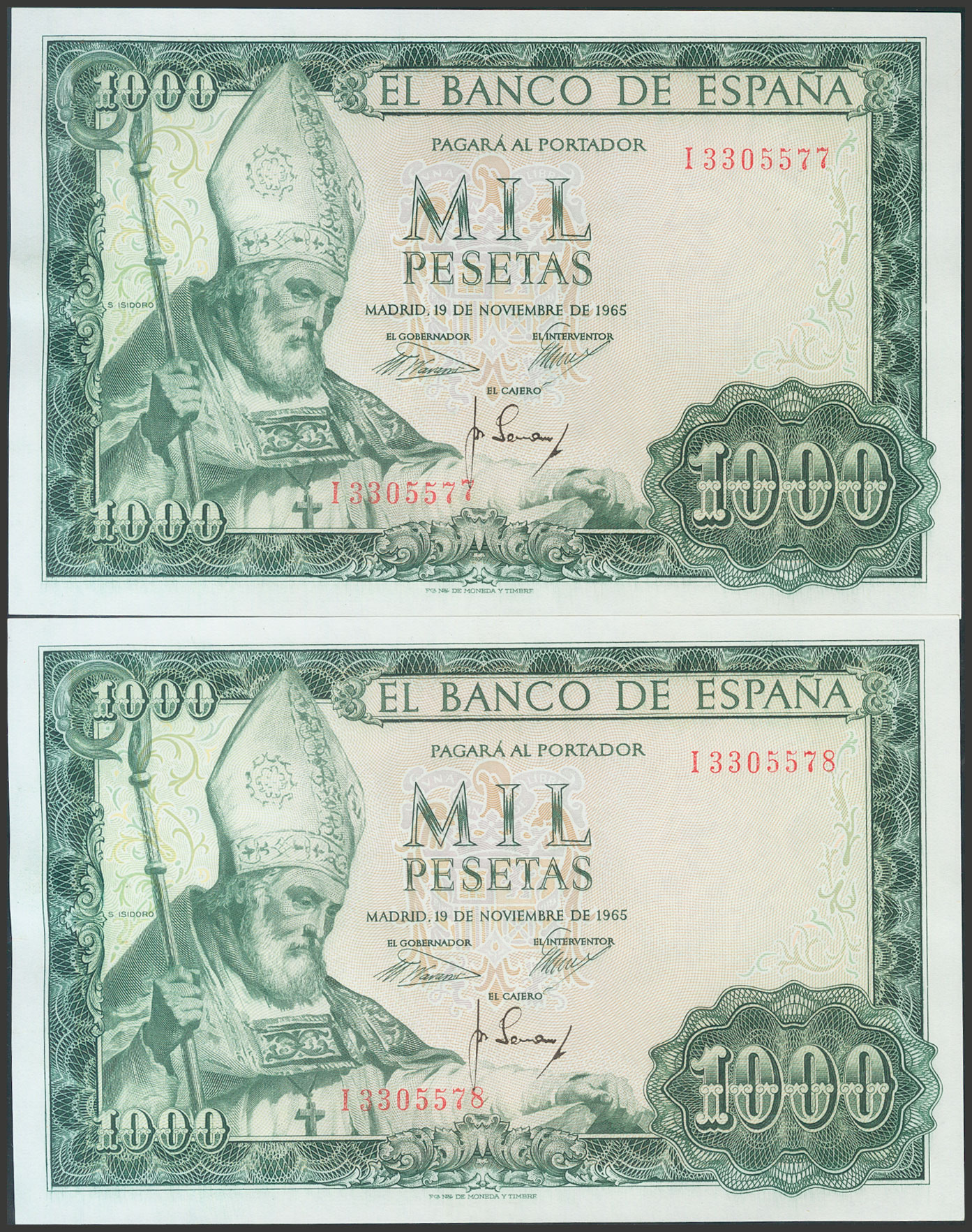 1000 Pesetas. 19 de Noviembre de 1965. Pareja correlativa. Serie I. (Edifil 2017: 471b). Apresto original. SC.