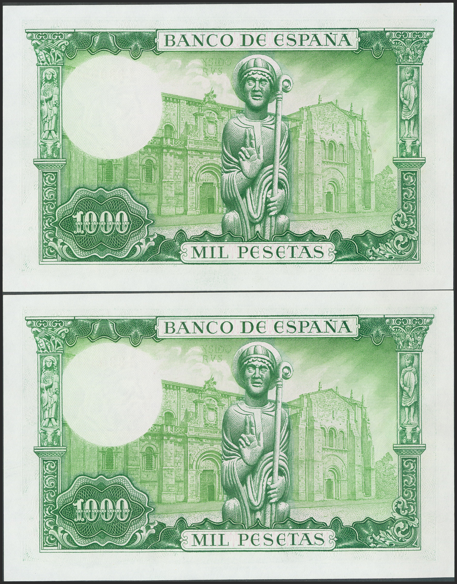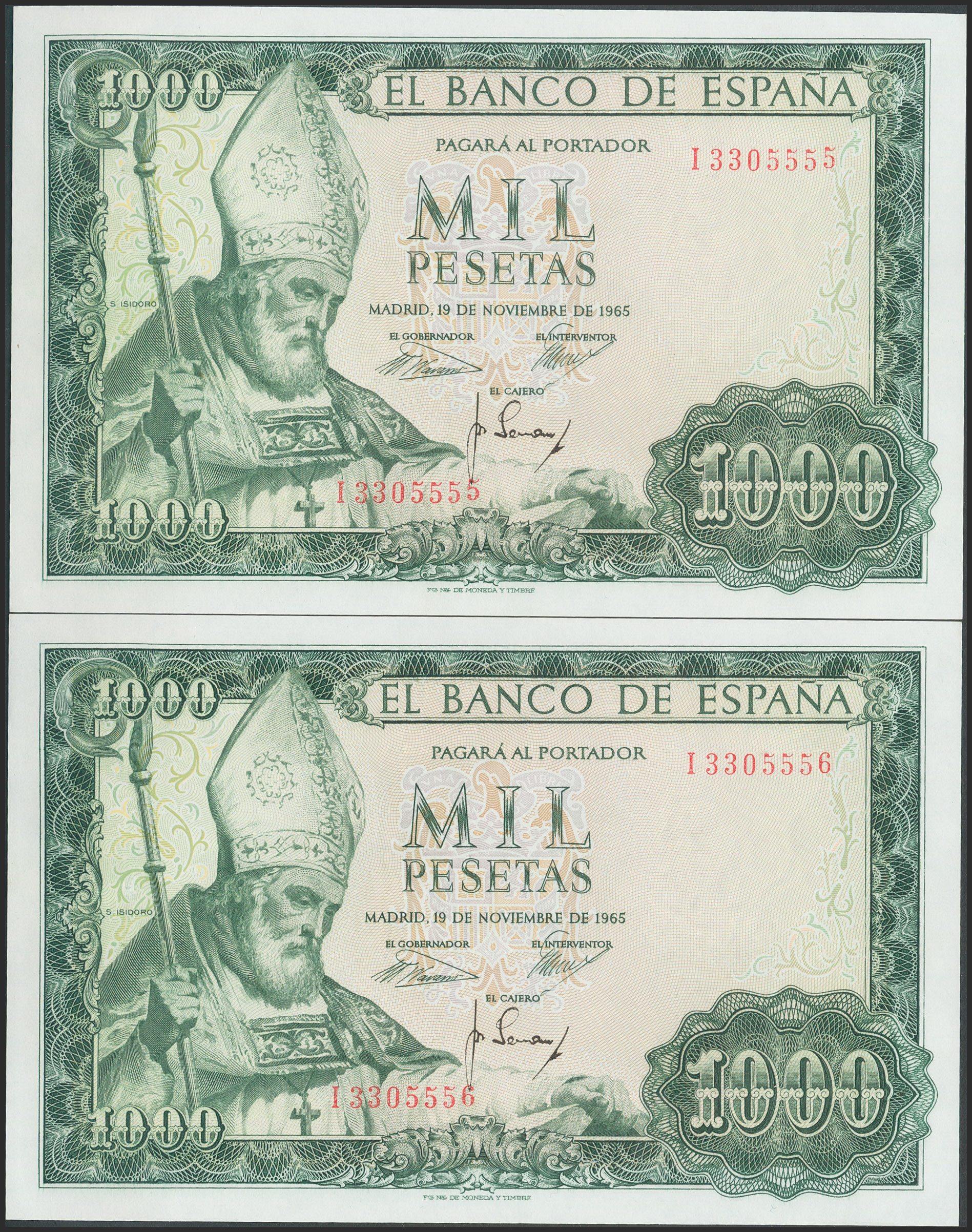 1000 Pesetas. 19 de Noviembre de 1965. Pareja correlativa. Serie I. (Edifil 2017: 471b). Apresto original. SC.